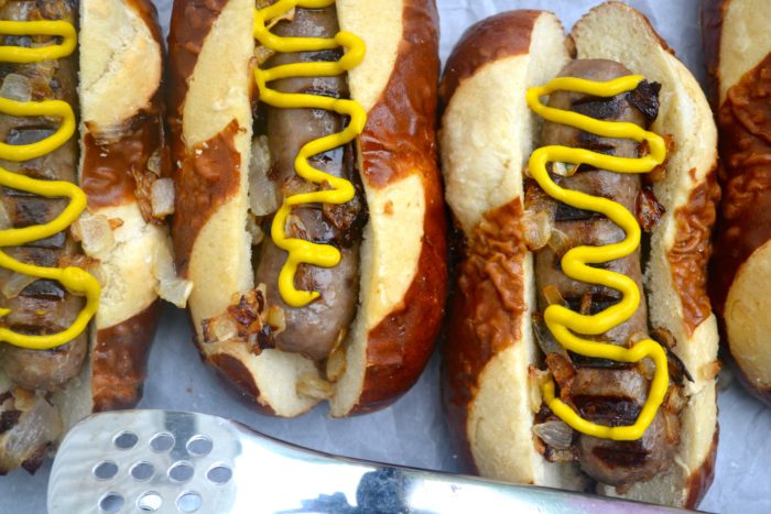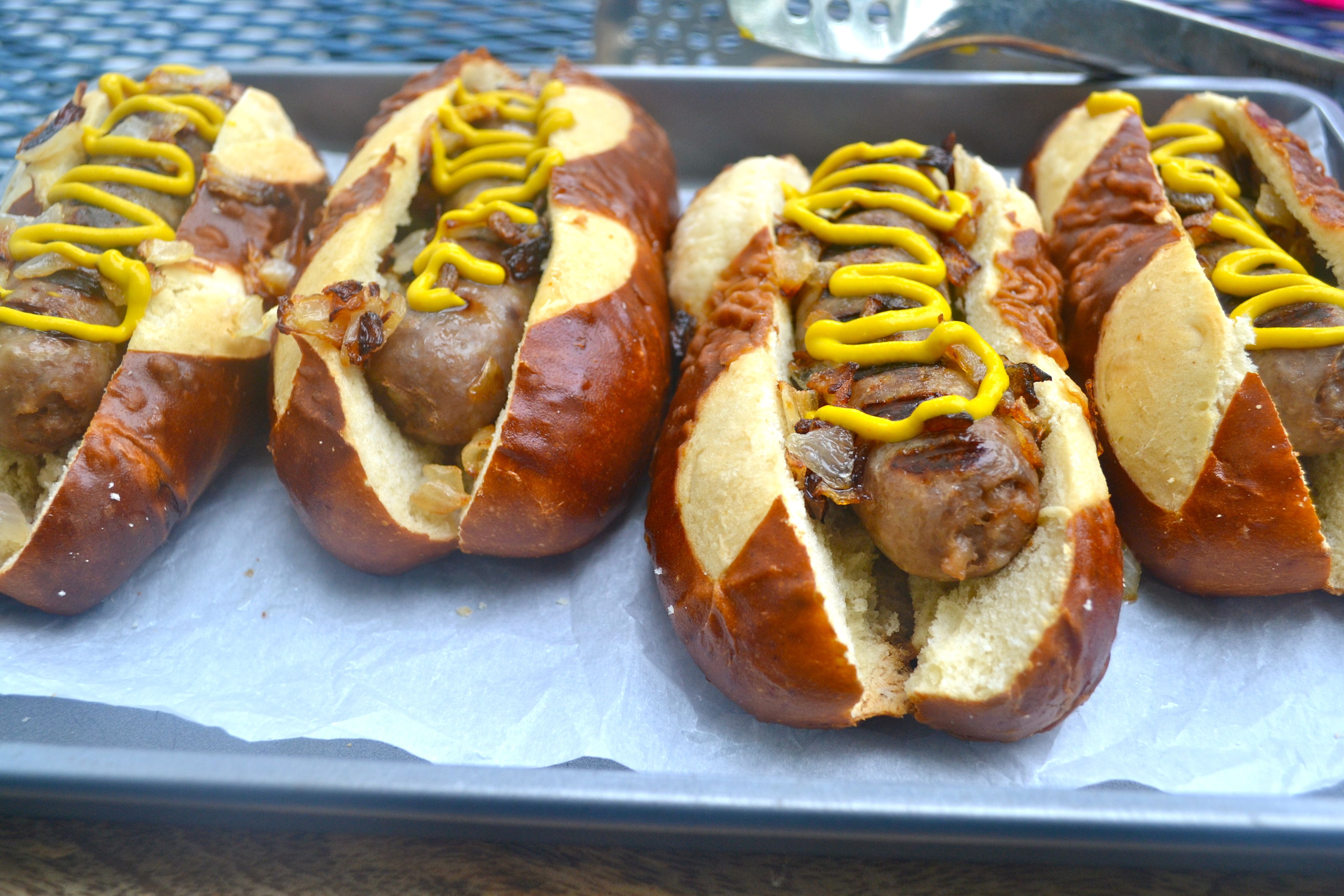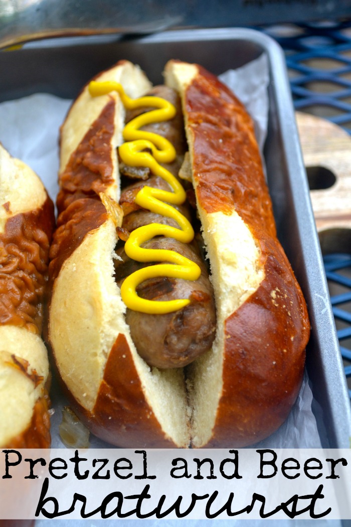 It is definitely grilling season and brats are on the menu. I like your choice of the pretzel bun.