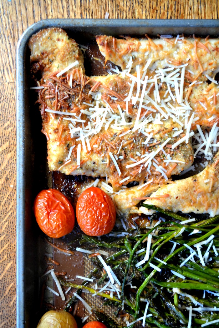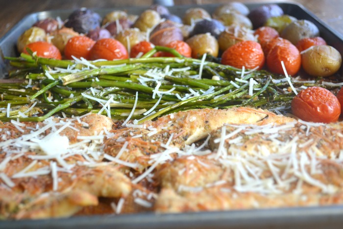 Method: Preheat oven to 400 degrees. Arrange chicken on sheet pan, pound chicken with a meat tenderizer. Boil potatoes for 5 minutes, and add to the sheet pan. Add asparagus . Sprinkle the entire pan with parmesan cheese, salt and olive oil. add Italian seasoning to chicken, and any other component of the dish you please. Add tomatoes. Bake for 30 minutes at 400 degrees. Remove from oven and serve.