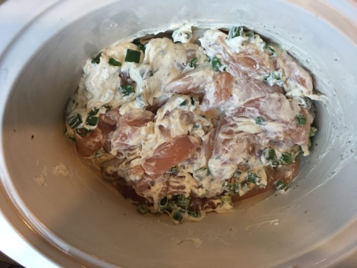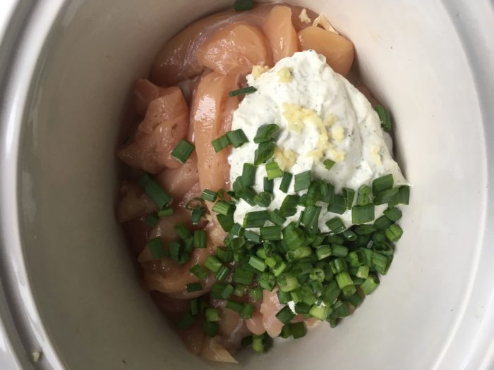 Method: In your slow cooker, place chicken, green onions, greek yogurt ranch, and garlic. Cook on low for 6 hours or on high for 4 hours. Shred chicken with a fork after it has been cooking for a while. Serve or put in the fridge for later.
