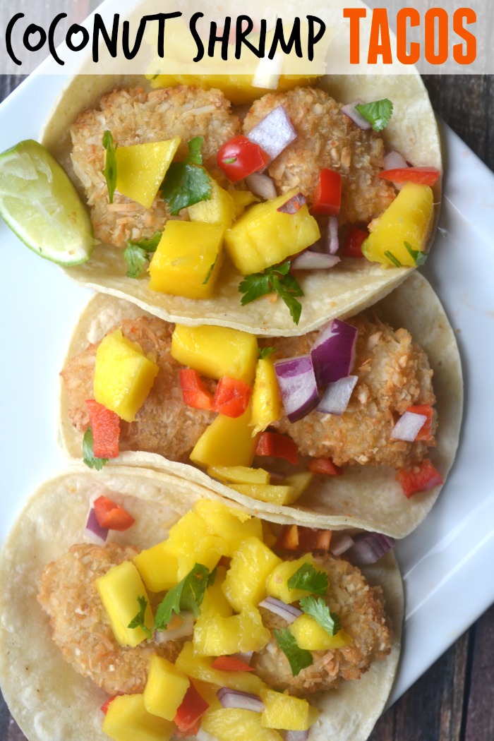 These coconut shrimp tacos with spicy mango salsa hit the spot. I used SeaPak® Butterfly Shrimp in these tacos. The shrimp was easy to cook and turned out perfectly crispy. Warm weather has been flirting with us lately, and eating these tacos is a great way for me to pretend that this weather will be here to stay. ( who am I kidding, we have as two weeks in a row, where 60-degree weather was followed by snow.)
