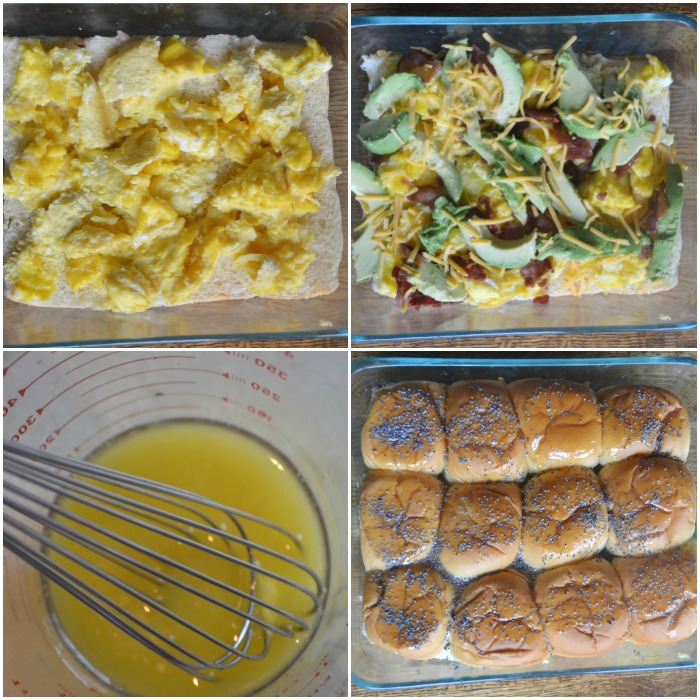 Method: Scramble eggs.  Cook bacon.  Cut Avocado, and slice.  Preheat oven to 350 F.   Cut the entire batch of Hawaiian rolls in half.  Arrange the eggs, bacon, avocados and cheese on the Hawaiian rolls.  Place the sandwiches in a baking dish.  In a bowl, prepare the sauce.  Melt butter, mix in maple syrup and Worcestershire sauce.  pour the sauce over the top of the sandwiches, and sprinkle on poppy seeds.