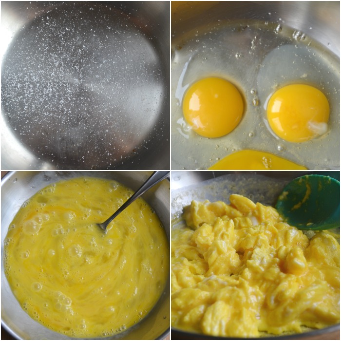 My favorite tip to making great scrambled eggs is to lightly salt the pan before placing the eggs in the pan.  It helps to evenly distribute the salt.