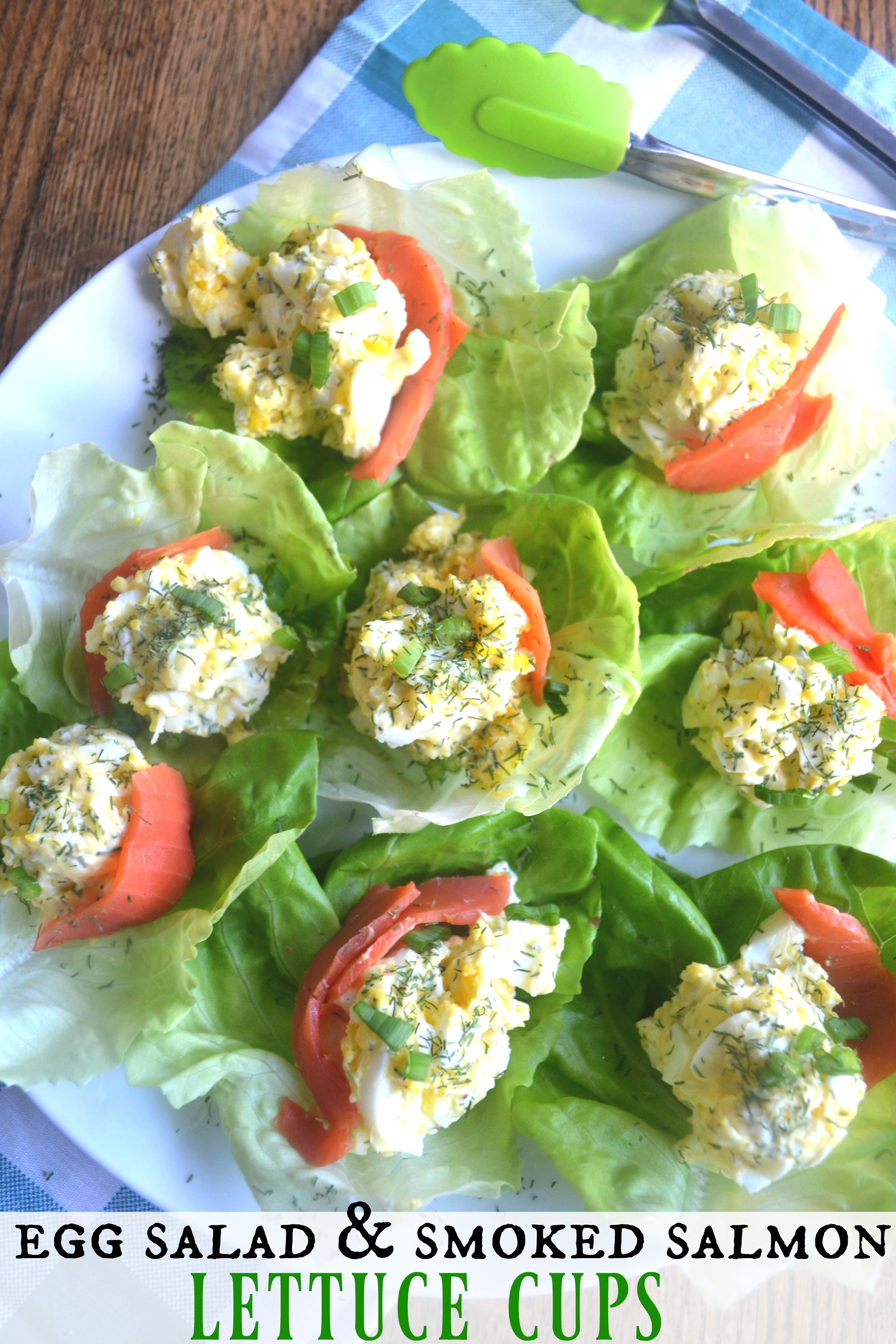 Method:  Peel 6 hard-boiled eggs and place them in a bowl. Smash the eggs with a fork and stir them.  Add mayo, salt, and dill weed.  mix the egg salad together.   Set aside.  Remove the lettuce cups from the butter lettuce.  Wash and dry each lettuce cup.  arrange the lettuce cups on a platter.  place a spoonful of egg salad into each cup.  top with a piece of cold smoked salmon, a sprinkle of dill weed and some chopped green onions.