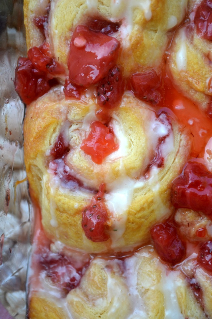 Your friends and family will love this easy semi-homemade strawberry sweet rolls recipe! You only need to whip up a quick strawberry sauce and bake up some store-bought crescent rolls!