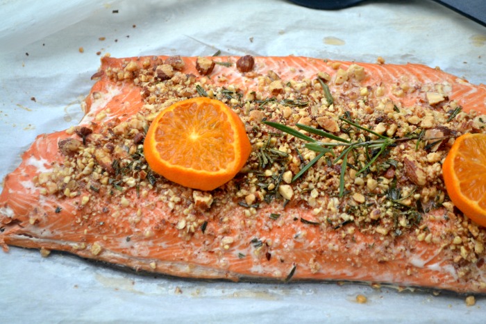 Method: Place salmon on a sheet pan and preheat oven to 400 degrees. In a food processor, pulverize two sprigs of rosemary, not the stems. Set aside. Chop almonds. Sprinkle almonds and rosemary on top of the salmon. Drizzle the salmon with olive oil and salt and pepper to taste. Place orange slices on top of the salmon and juice the orange on top of it. Bake for 18 minutes. Or at a different time if you’re portion size is different.