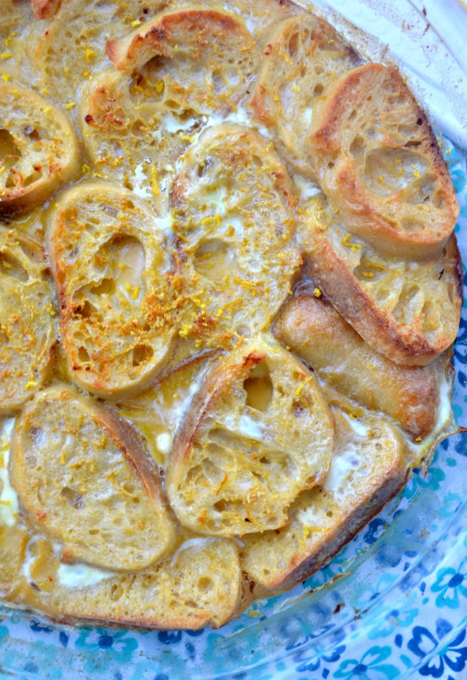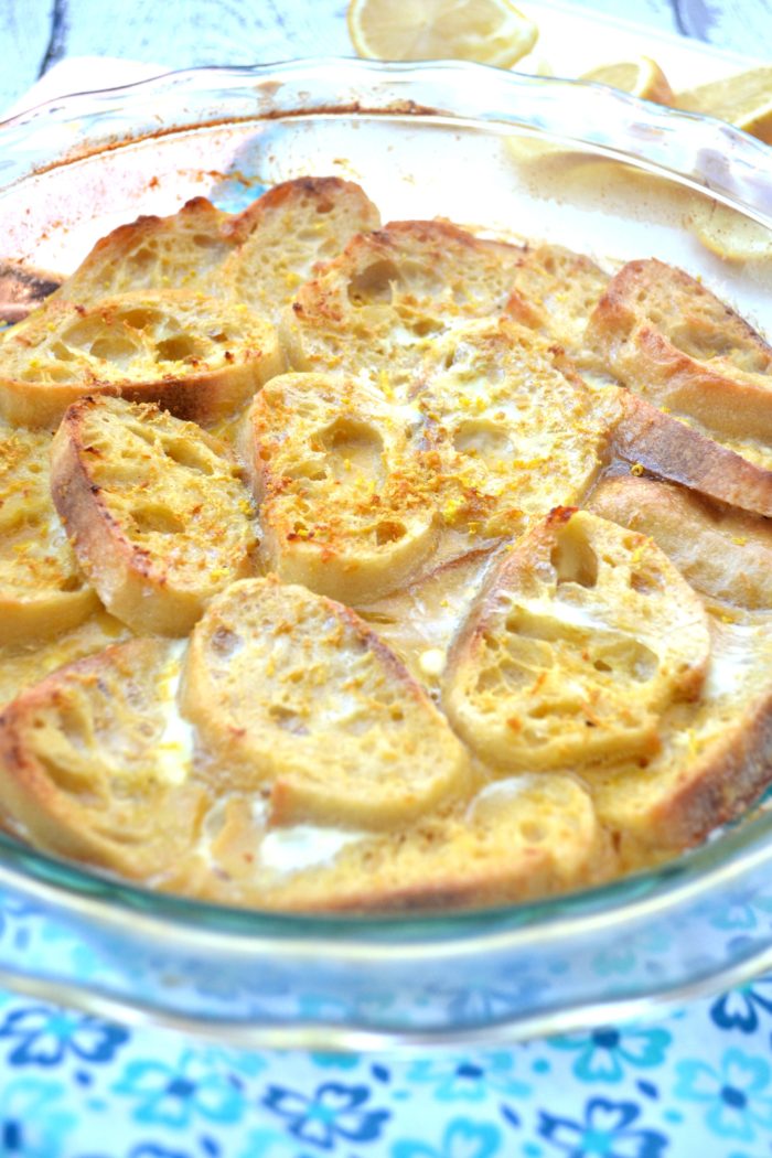 Method: In a bowl, whisk together eggs, milk, sugar, vanilla and lemon juice. Cut baguette into thin slices and arrange them in a casserole dish. Pour the egg mixture over the bread and sprinkle lemon zest on top of the casserole. Cover the casserole and let sit in the fridge overnight. In the morning, preheat your oven to 350 degrees. Cook covered for 30 minutes. Uncover and cook for another 15 minutes. Remove from oven and enjoy!