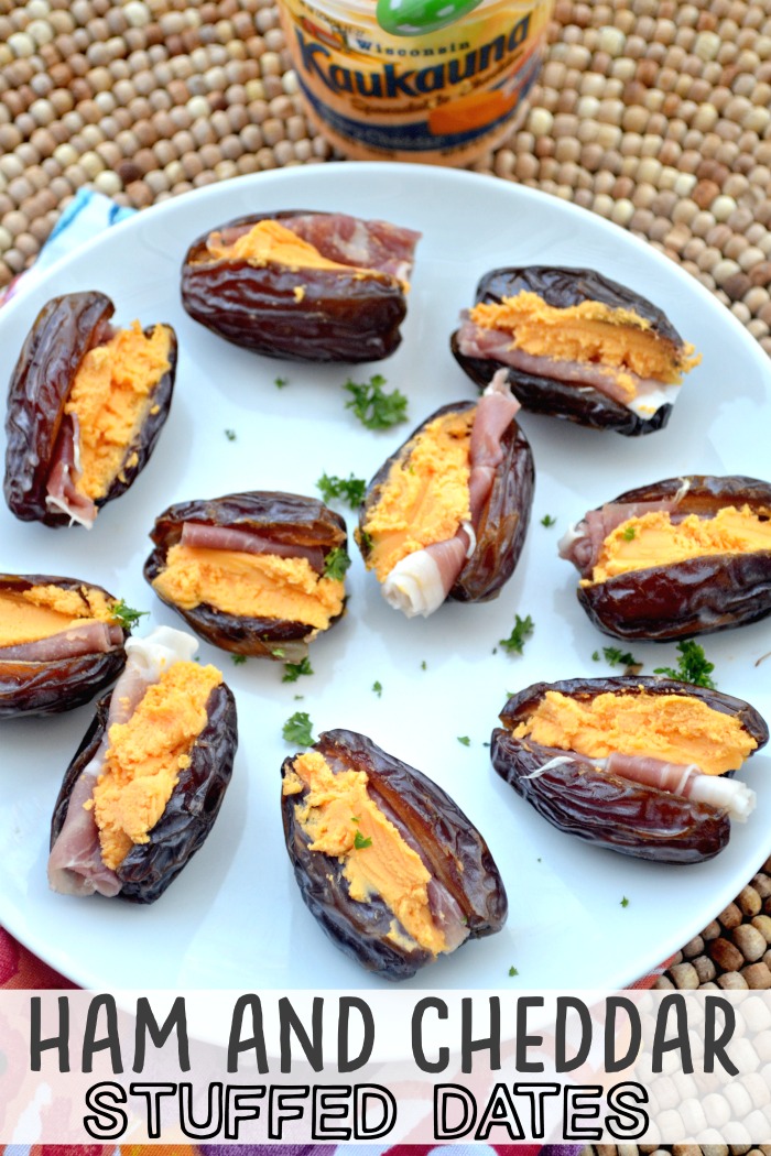These ham and cheddar stuffed dates were so good! I really think that almost any stuffed date appetizer can really be a show stopper. I love that these are so easy, you can make them quickly when visiting someone else for a family get-together. Plus the addition of Kaukauna® sharp cheddar cheese spread makes these taste wonderful.