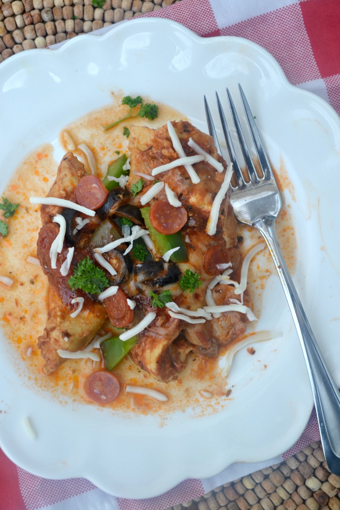 My two youngest sons, who are 4 and 1 are not big meat eaters; I do think that its a texture thing for them. But both of them ate three pieces of chicken each when I made this, and I was thrilled. Plus, I love building the pizza on top of a piece of chicken. Chicken takes on the flavor of whatever it is being cooked with, and I was able to enjoy some pizza, guilt-free.