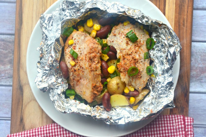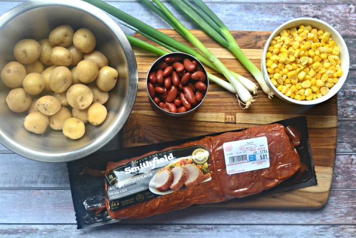 Prepare foil packets. Tear off 4-6 pieces of tin foil and fill them. Place the potatoes on the bottom, followed by beans and corn. Cut the Smithfield Slow Smoked Mesquite Flavor Pork Loin Filet into 1-inch slices, place 2 slices into each foil packet.