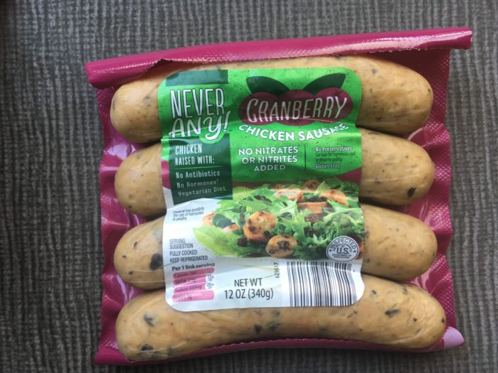 Aldi carries chicken sausage in a bunch of different flavors! I love keeping this around because it is precooked and will keep in the fridge for a few weeks. This chicken sausage is so easy just to cut, heat and together with pasta, rice or salad. My kids love it Plus it contains no nitrates and contains no hormones. It is also reasonably priced.