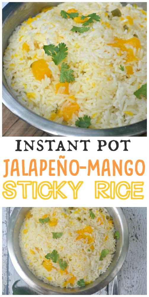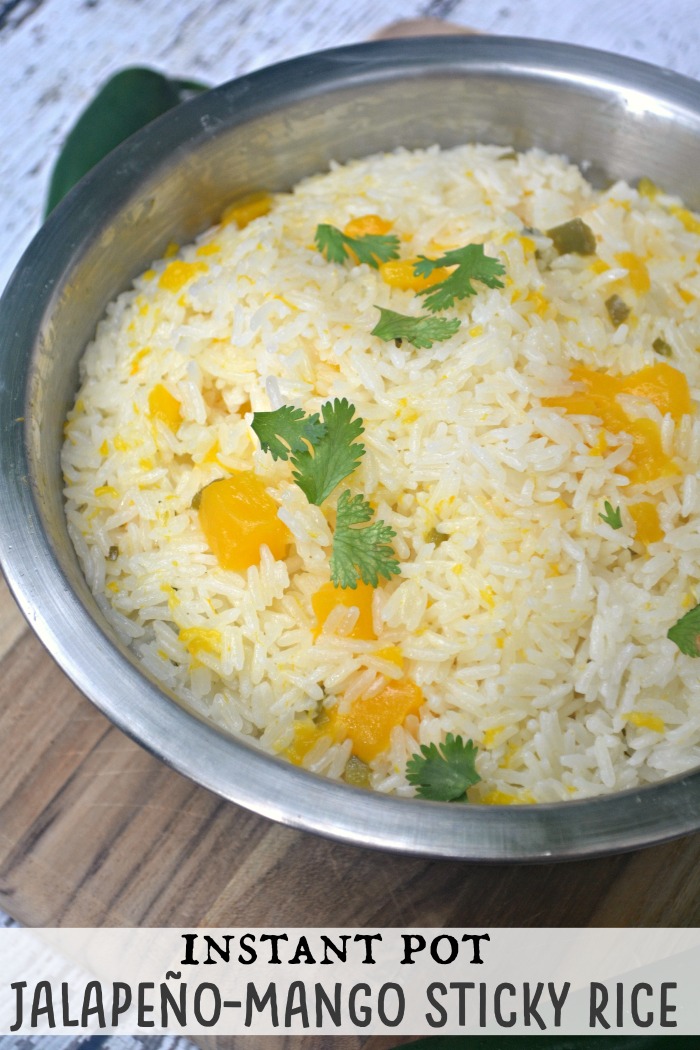 I used this formula for sticky rice and replaced some of the water with a can of mango. I just found this canned mango for the first time last week at Super Target. I picked up a bunch of it, and I also used it in my Mango Chicken Lettuce Wraps.
