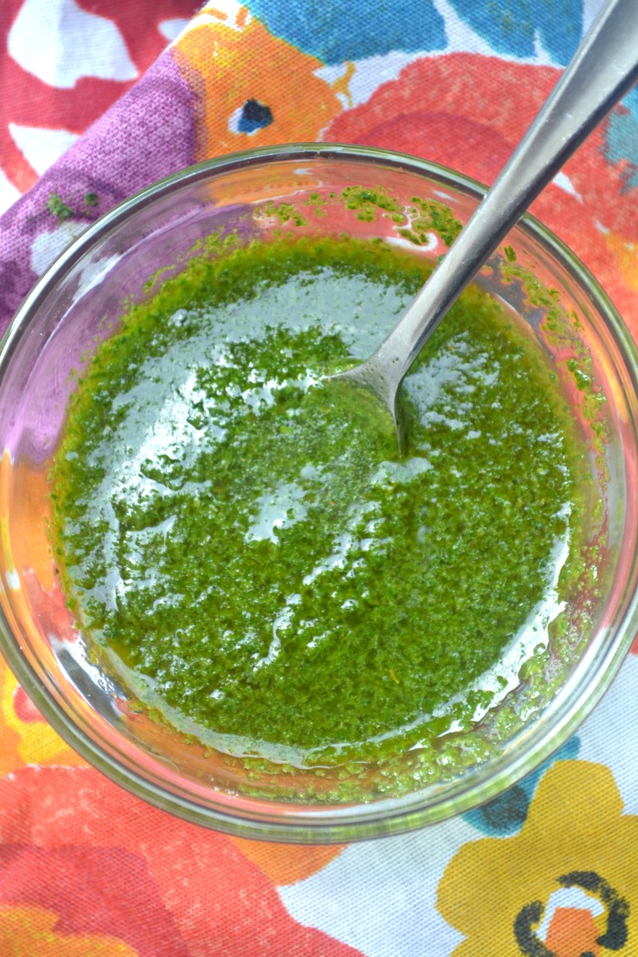 Chimichurri sauce is super flavorful and potent. A teeny bit of sauce goes a long way; I think my favorite ingredient in chimichurri sauce is the red wine vinegar. It gives it a tangy flavor that makes it amazing!