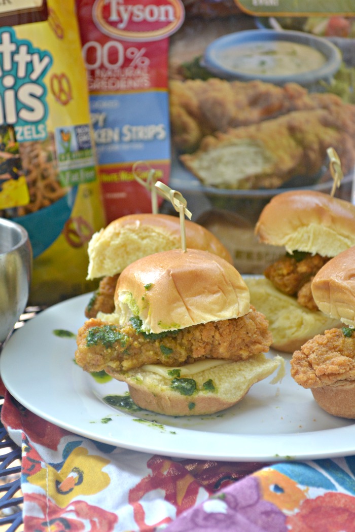 This is a great meal to share with friends or to have as a family while tailgating or watching football at home. I love how easy it is to throw these sliders together; you can prep the chimichurri sauce in advance and store it in the fridge or even freeze it. The chicken is precooked and just needs to be heated up in the oven for a few minutes. The pretzels—well, the pretzels come ready to put in a bowl and enjoy.