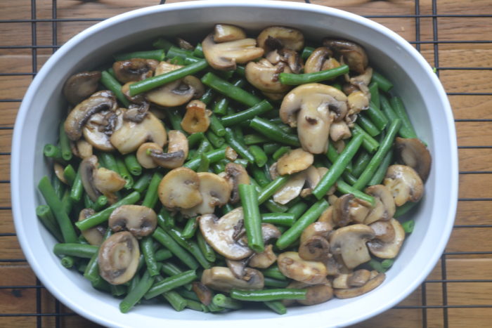- Build your casserole. Mix green beans, mushrooms, and sausage gravy together.