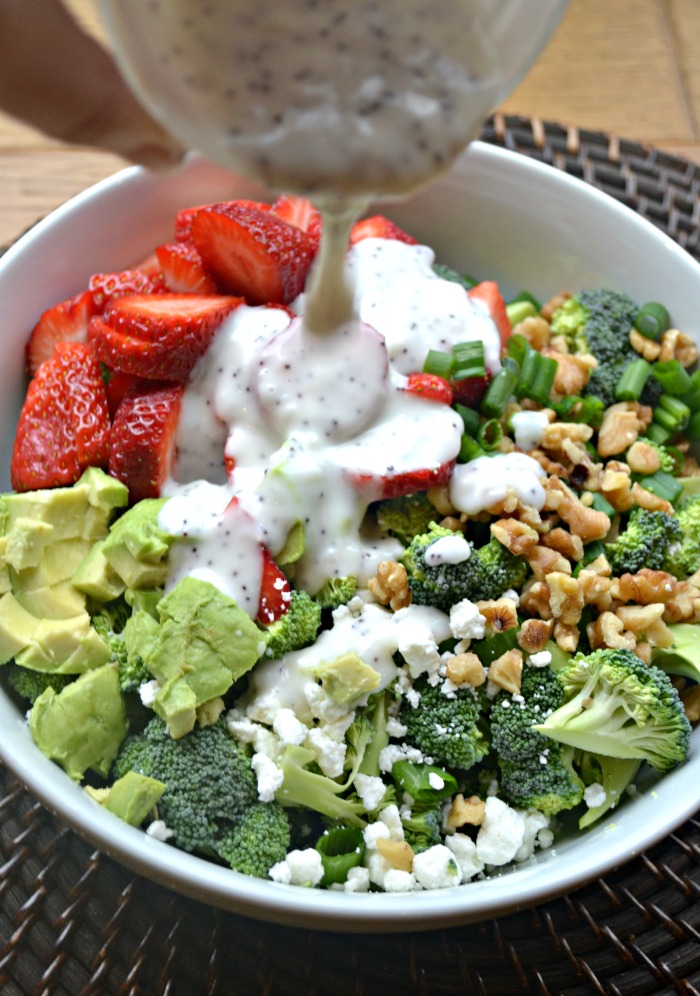 Strawberry poppyseed spinach salads might be my favorite summer salad. Even though it is winter, I decided to turn my favorite salad into a delicious broccoli salad. I happened to find some super red strawberries at the store the other day so that I couldn’t help myself. What do you usually add to your strawberry poppyseed salad? I always add walnuts, avocado, and feta cheese.