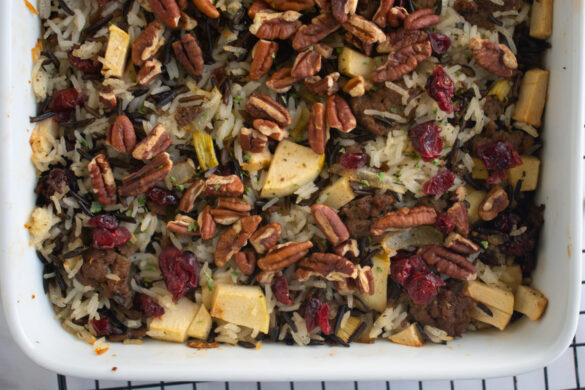 You will love the sweet and savory taste of this wild rice stuffing, and you won’t even miss traditional bread stuffing at your holiday gathering this year.