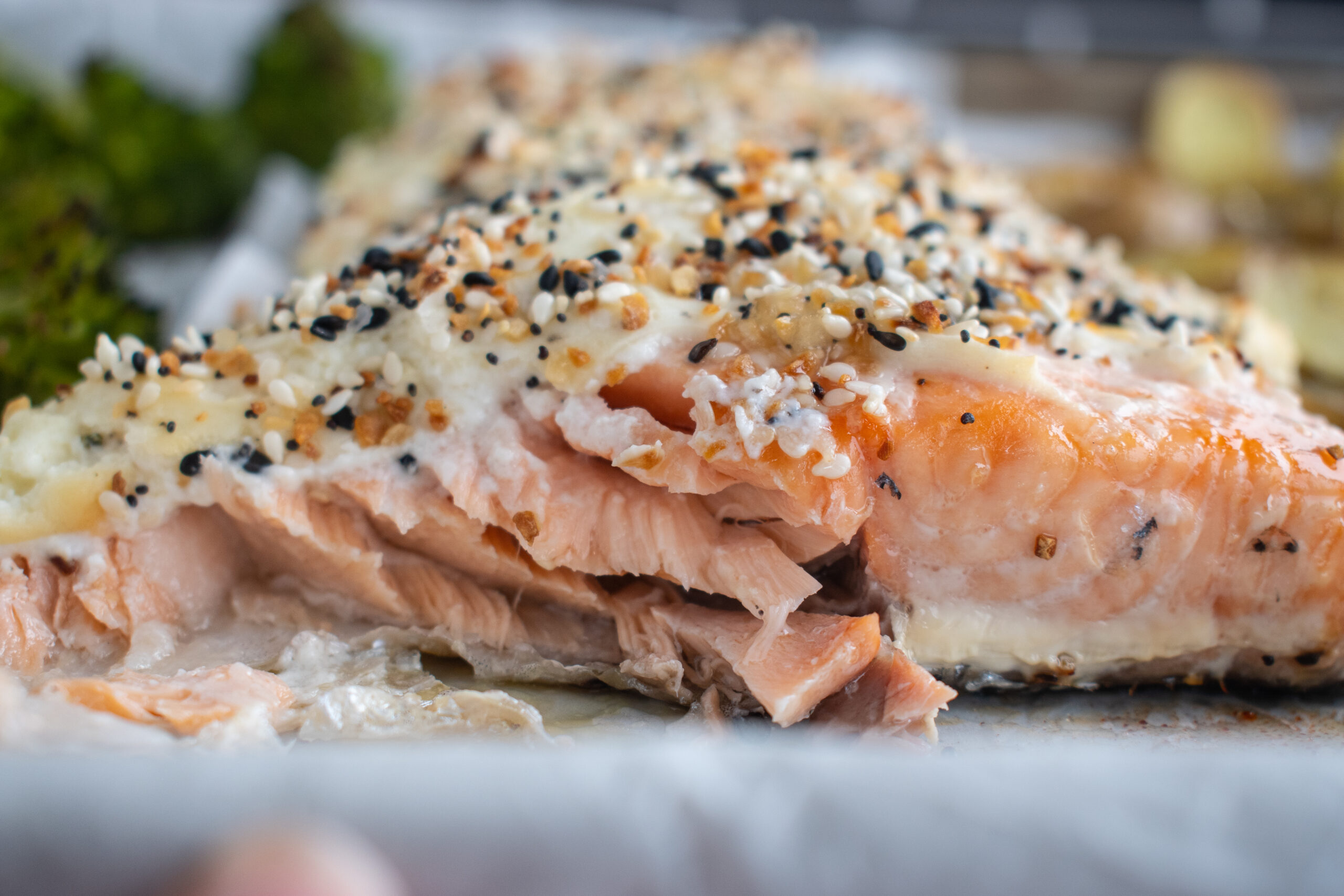 Sprinkle the salmon with Everything but the bagel seasoning.