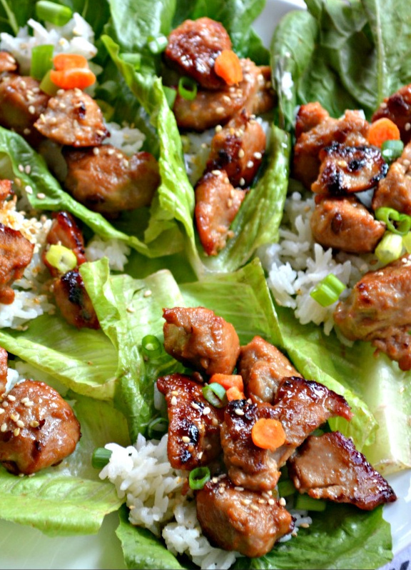 Teriyaki pork lettuce wraps combine sweet and savory flavors and are served in crunchy romaine lettuce eaves. They’re perfect for lunch, dinner, or an appetizer!