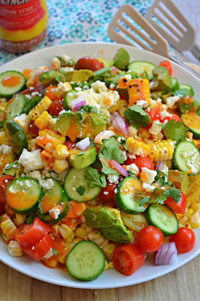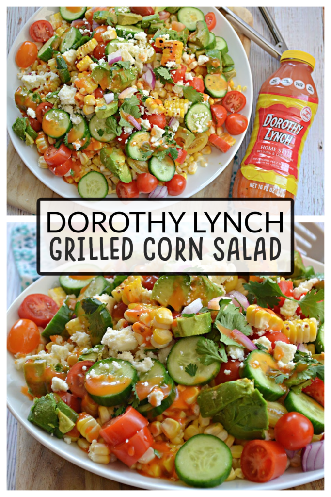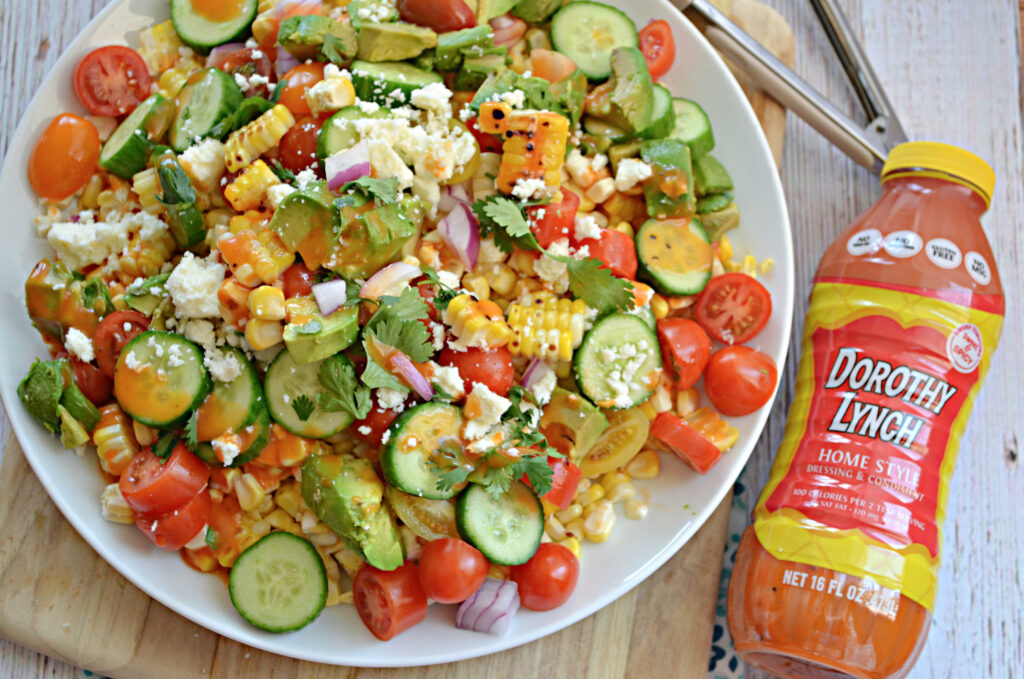 Sweet Corn is one of the greatest pleasures of a midwest summer. This summertime grilled sweet corn salad will please everyone at your next potluck! This salad has smokey grilled sweet corn, cucumber, tomatoes, red onions, creamy avocado, and Cotija cheese. The top of the salad is decorated with cilantro and drizzled with another midwestern classic, Dorothy Lynch Dressing & Condiment.