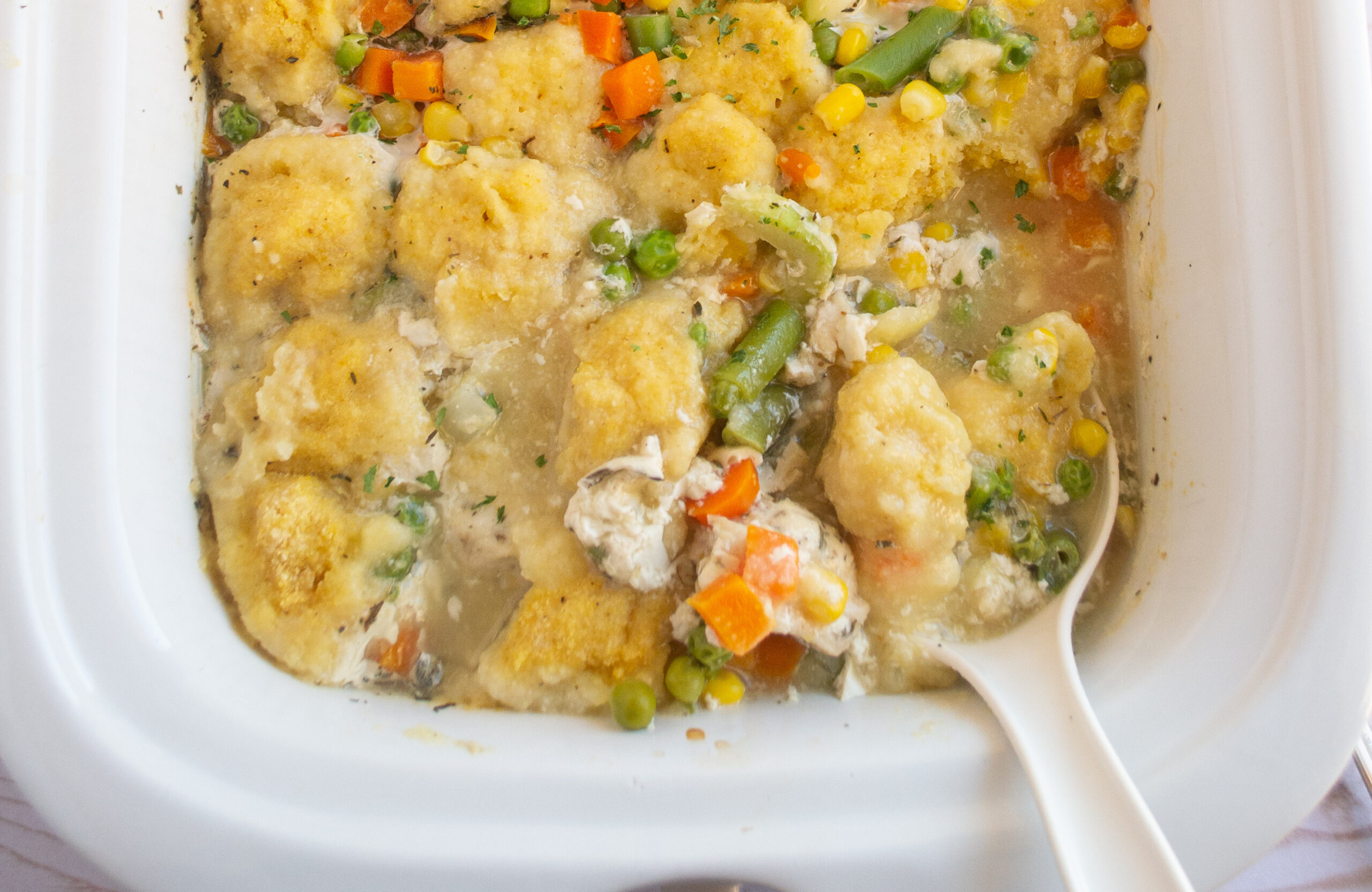 This slow cooker chicken and cornbread dumplings is an easy meal to throw together in your crockpot. No cream of chicken soup is needed for this recipe, although you can add some to the chicken mixture if you like. This will become your favorite crockpot chicken recipe! This meal is cooked in a low-heat setting. Your family will love the sweetness of the cornbread dumplings and the comfort of creamy chicken on a cold day.