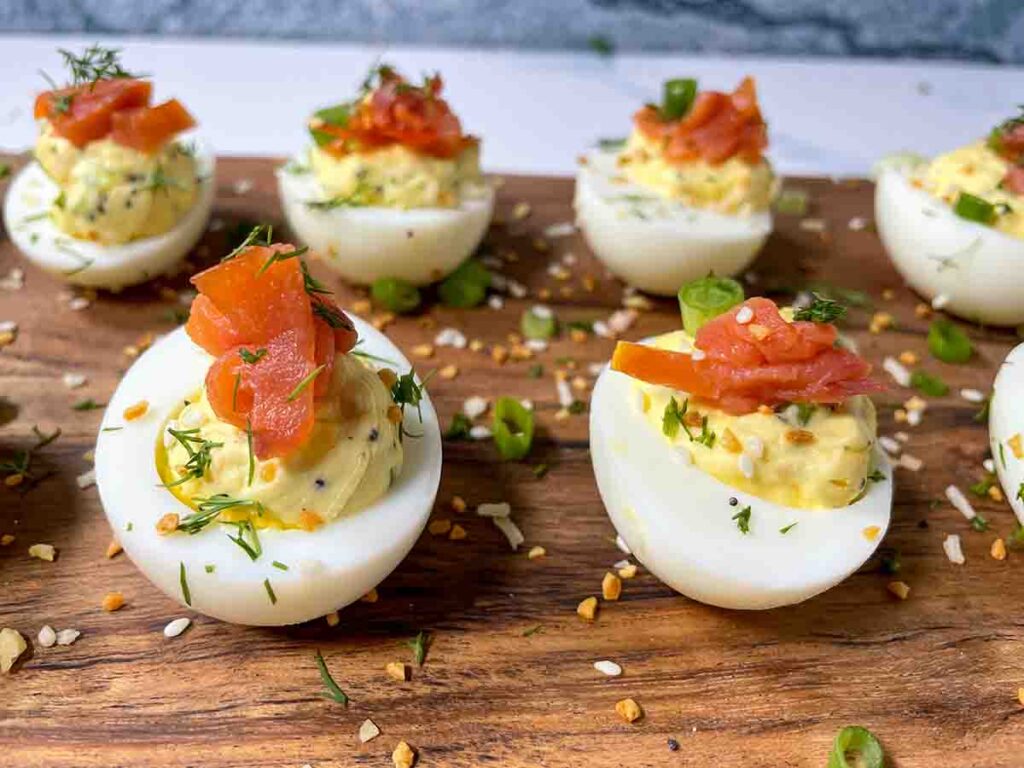Everything bagel seasoning and deviled eggs are perfect for each other! Add a little cream cheese and smoked salmon, and these Everything bagel-deviled eggs will be the hit of the party.