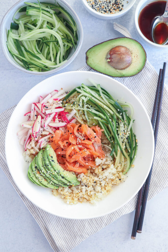 Low Carb Smoked Salmon Sushi Bowl is made with cauliflower rice, smoked salmon, crunchy fresh veggies, creamy avocado, and drizzled with a super easy yet flavorful 3-ingredient dressing.
