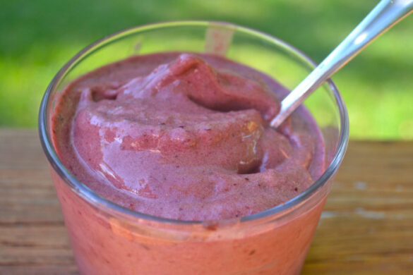 This blueberry ice cream is so good! Also, try this exact recipe with blackberries! Adding blueberries and vanilla makes the perfect bowl of banana ice cream!