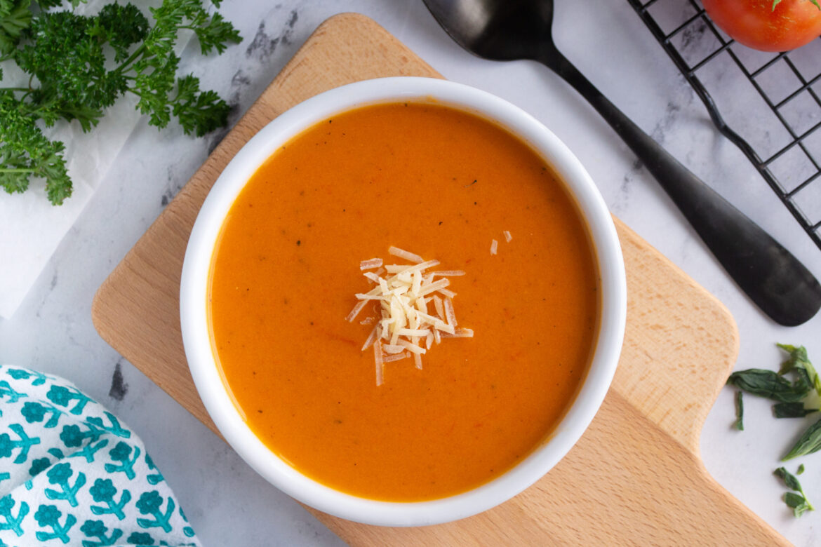 Fresh herbs, parmesan cheese, a dollop of sour cream, and oyster or goldfish crackers make great garnishes for your tomato soup. If you like to add spice, red pepper flakes or hot sauce also tastes fantastic on top of this tomato soup.