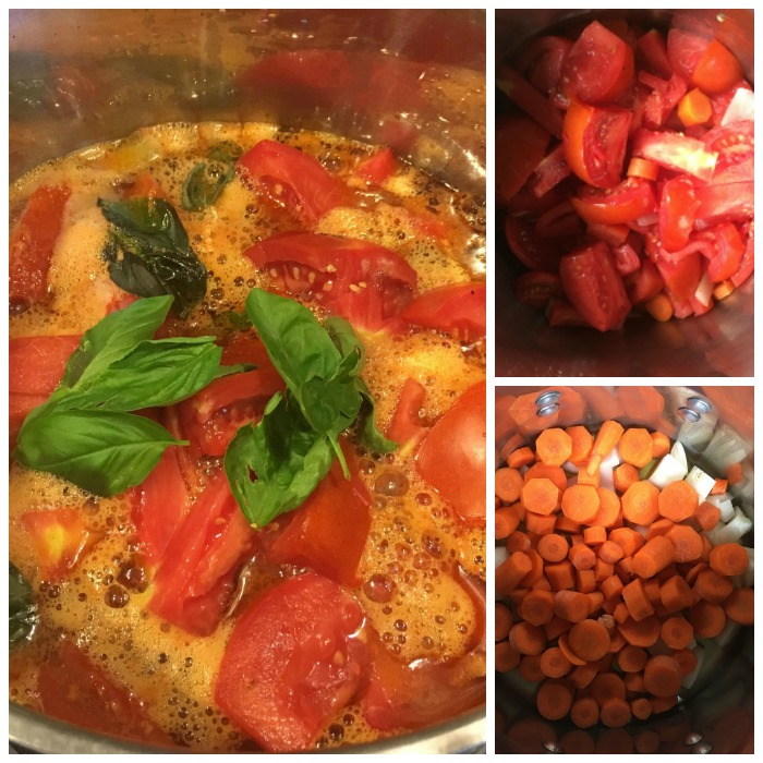 Add tomatoes, carrots, tomatoes, garlic, basil, and stock.