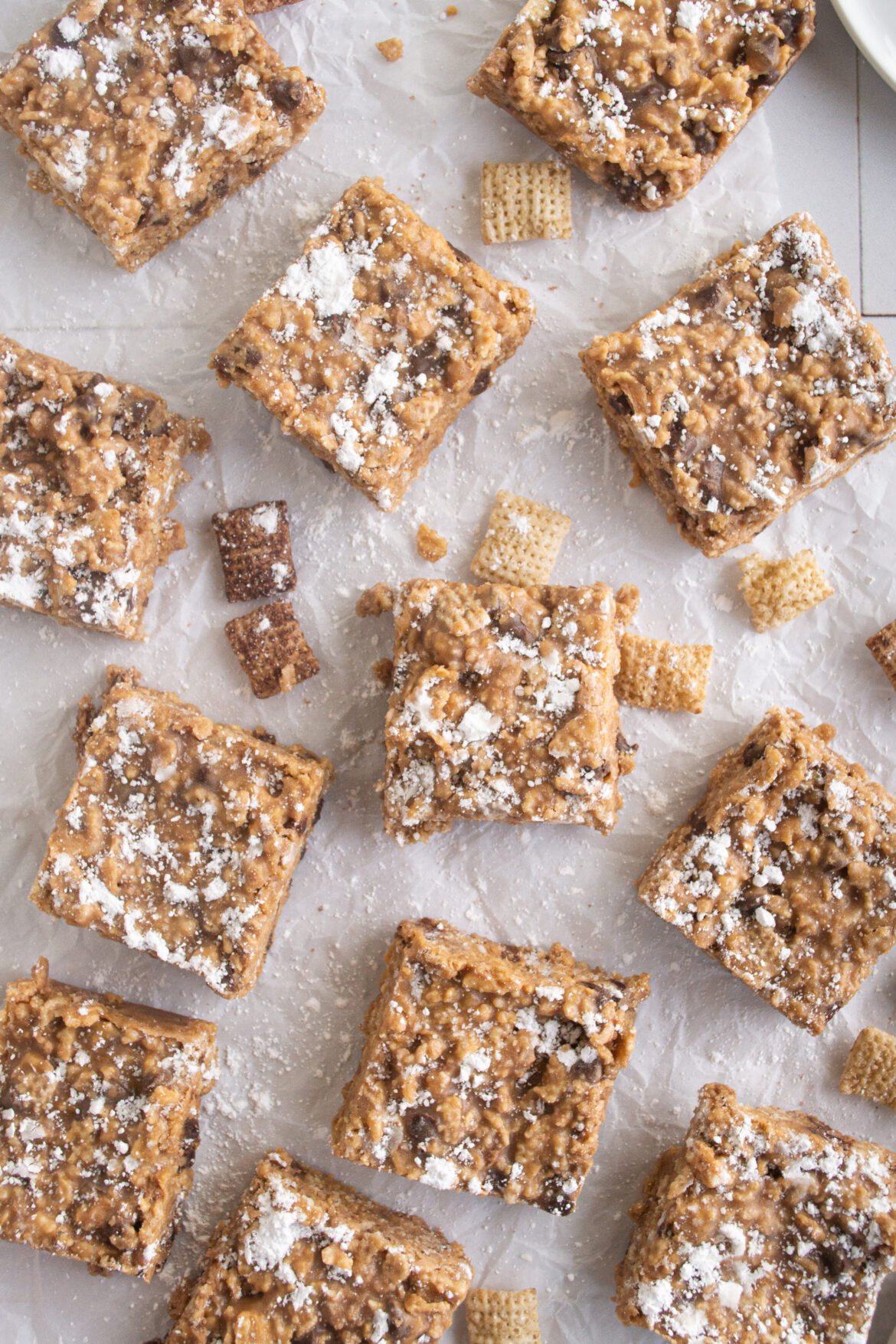Families across the midwest have been making “puppy chow” in their kitchens since the 1960s. It also goes by Muddy Buddies, Raindeer Chow, Monkey Munch, Chow, or Doggy Bag. Puppy Chow is a snack where you mix Chex cereal with melted chocolate and peanut butter, then coat it in powdered sugar. I have made a no-bake, no-melting chocolate version of puppy chow squares that your family will love!