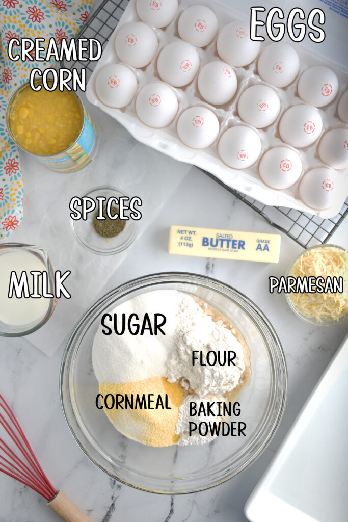 The secret to making your cornbread soufflé light and fluffy is using more eggs than you otherwise would when making regular cornbread. Instead of using 1-2 eggs as you would in many cornbread casserole recipes, I used four eggs. This makes the cornbread casserole rise more and makes it super fluffy.