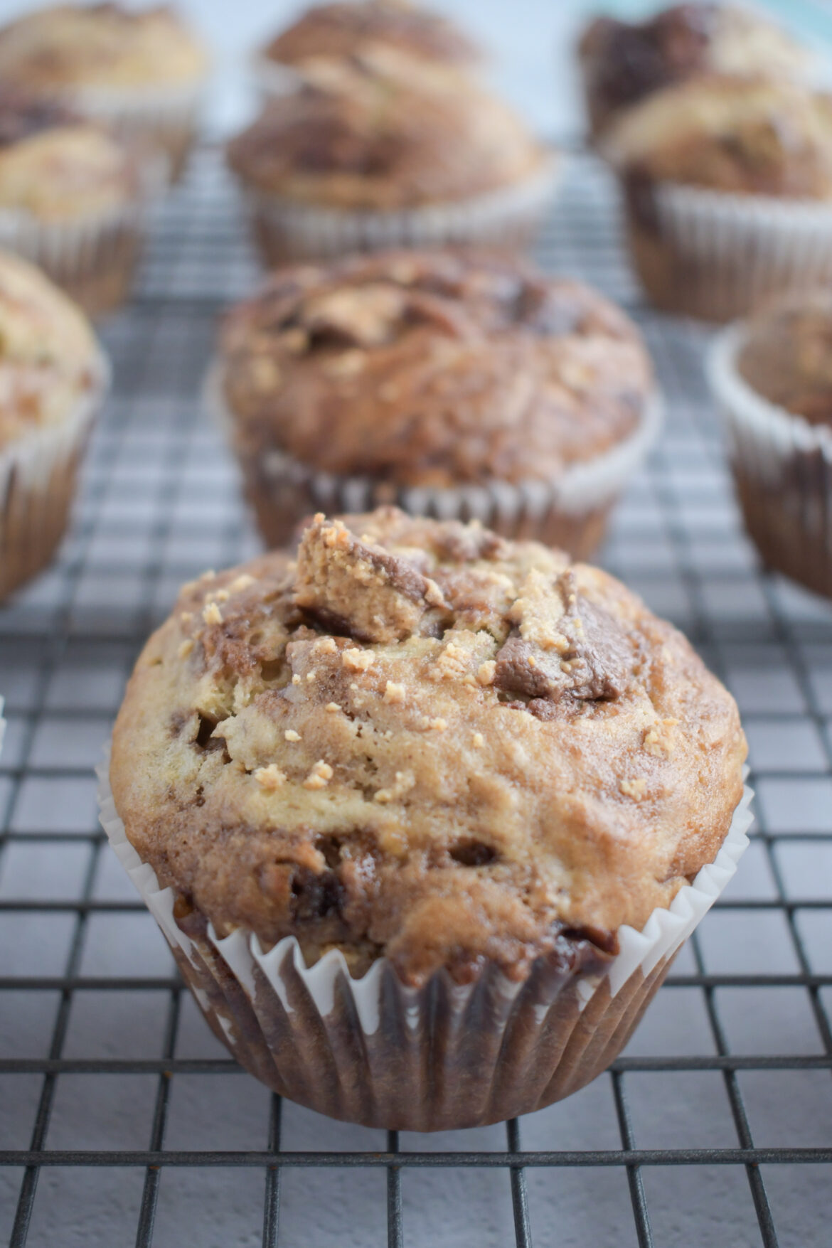 These moist and fluffy moose tracks banana muffins are the perfect peanut buttery treat any day. You can whip these muffins up on a whim. They taste great with a piping hot mug of coffee and tea when you need to unwind. Or these will be the star of your brunch spread! You will love the peanut butter flavor the peanut butter cups bring to this recipe. You can also substitute almond butter cups or another nut butter for this recipe.