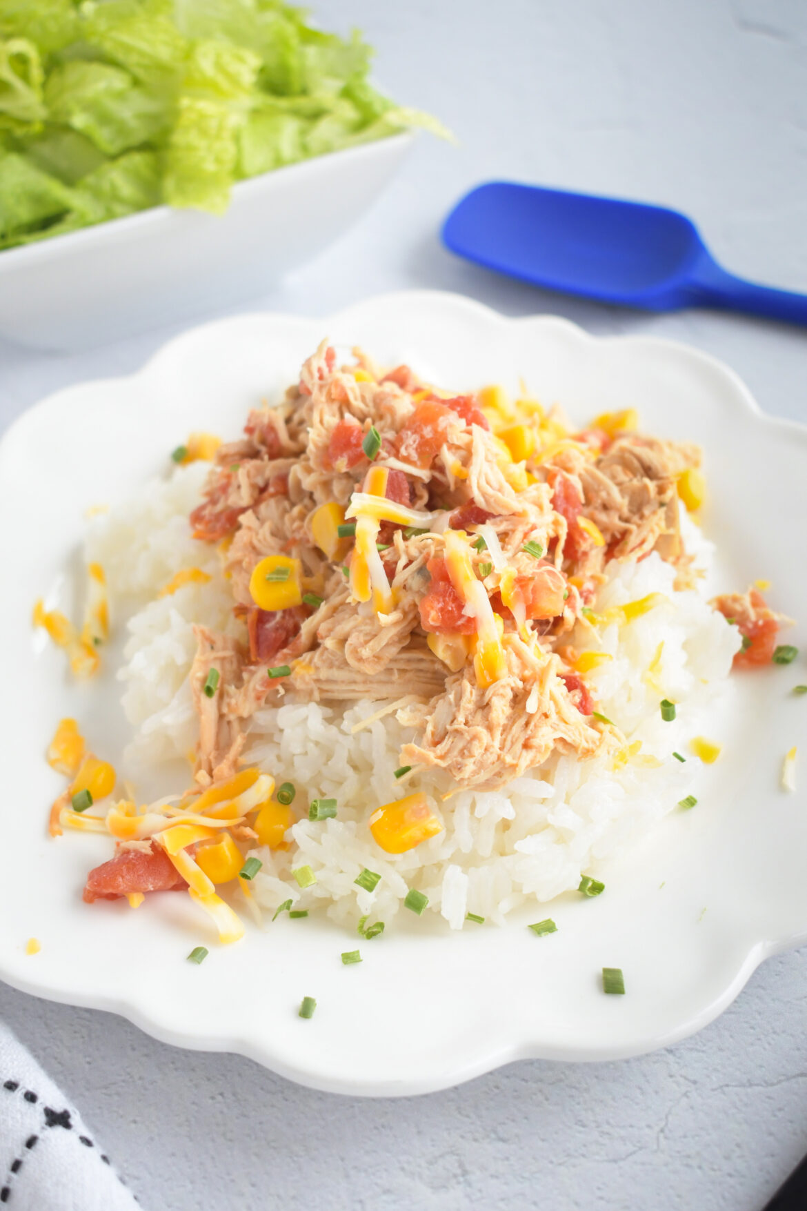 This creamy Rotel chicken mixture can be used for burrito bowls, nachos, tacos, quesadillas, pasta, salads, grain bowls, or lettuce wraps.