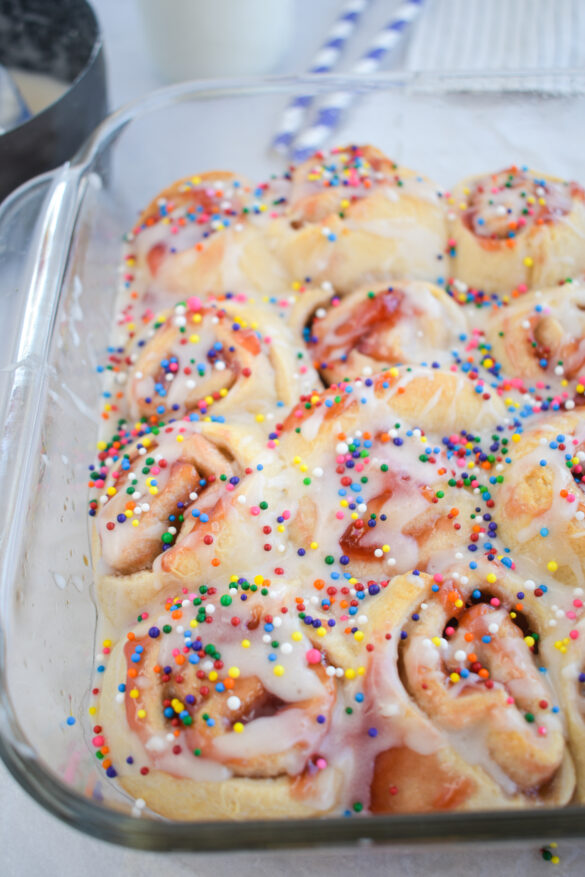 8. Drizzle pop tart glaze on top of the rolls and add sprinkles.