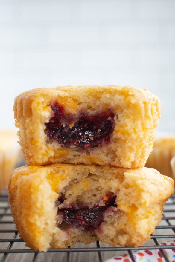 Using a cookie scoop, spoon batter into the muffin pan cup 1/2 way full. Add a scoop of raspberry jam into each muffin, then place one more peach muffin batter on top.