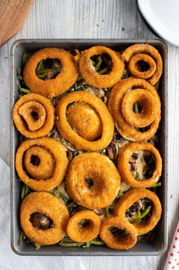 This is the easiest and most delicious Green Bean Casserole you can make! All you need is FIVE ingredients and a sheet pan. The golden brown crispy onion rings on top make this recipe unique and mouthwatering!