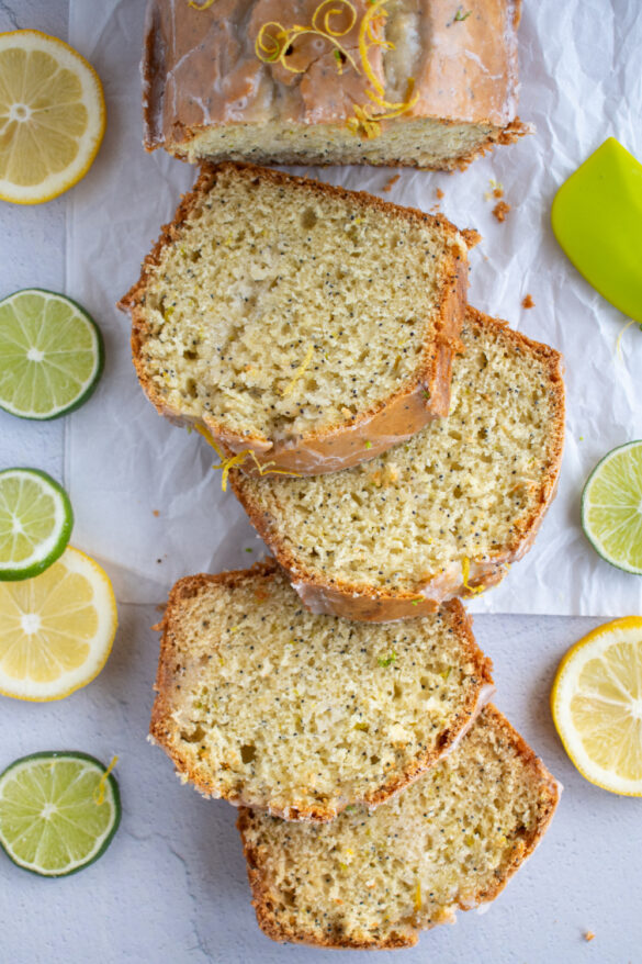 Spring and summertime are perfect for bringing this bright citrus-filled bread to your family gatherings. This lemon-lime poppy seed loaf has lemon juice, lemon zest, and lime zest. Adding lime to a traditional lemon poppyseed bread recipe instantly upgrades it! This bread is moist but still crumby. Don’t forget to add the lemon-lime glaze. The glaze puts this recipe over the top.