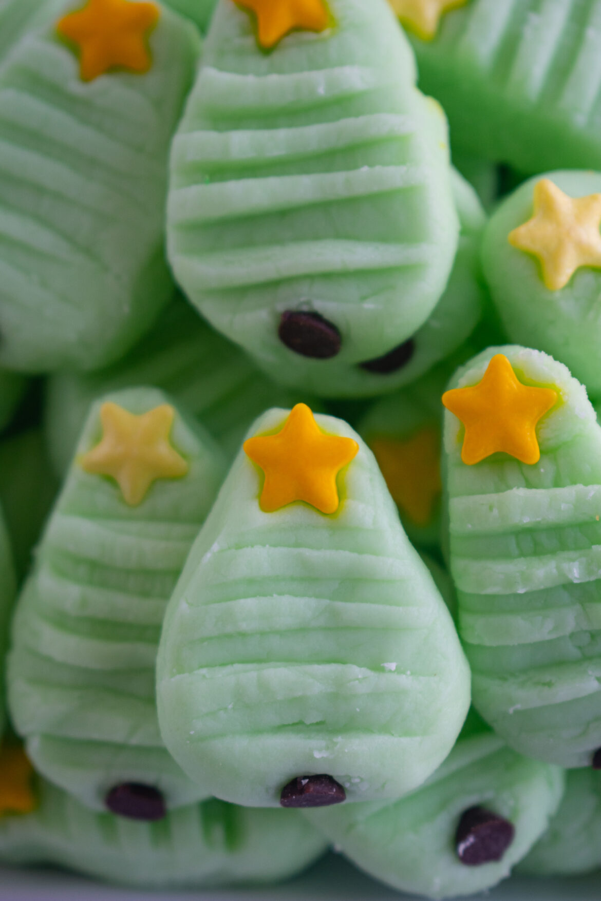 Cream Cheese mints are a classic dessert here in the Midwest. Cream Cheese mints are also known as Christmas Mints, Wedding Mints, or Baby Shower Mints. These are easy to throw together in no time and are always a huge hit with guests around the holidays. Usually, cream cheese mints are shaped in a circle, but I decided to mold these slightly differently to make these candies look like Christmas Trees!