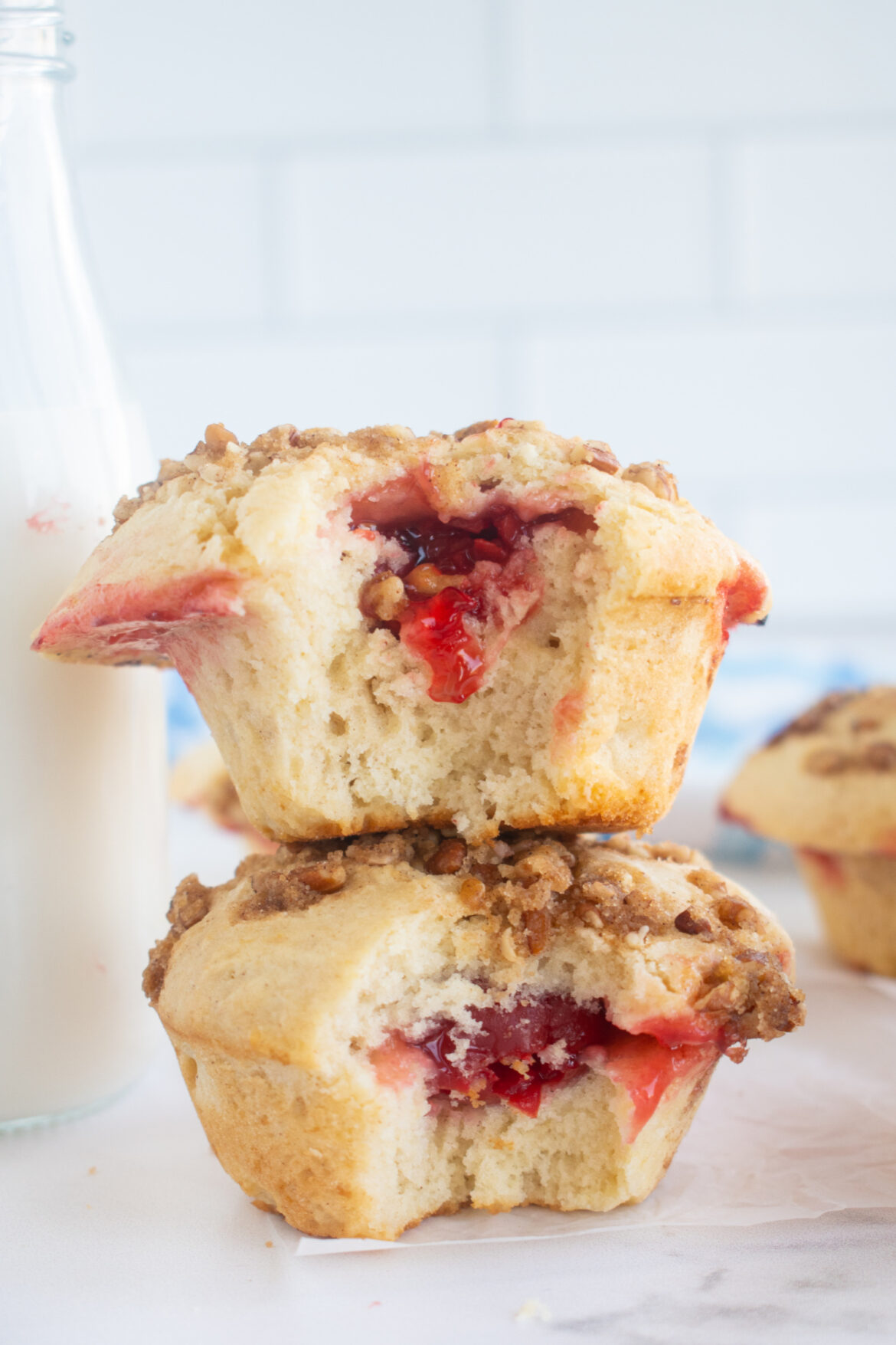 When I was a kid, my mom made ” muffin surprise,” which were muffins with jam in the middle. It was always a surprise which jam we would get in our muffins. I used that concept in this recipe, but pie filling was used in the middle. The muffin recipe I used tastes similar to a traditional cobbler but is fluffy like a muffin. The strusel topping is the perfect finishing touch to this recipe.