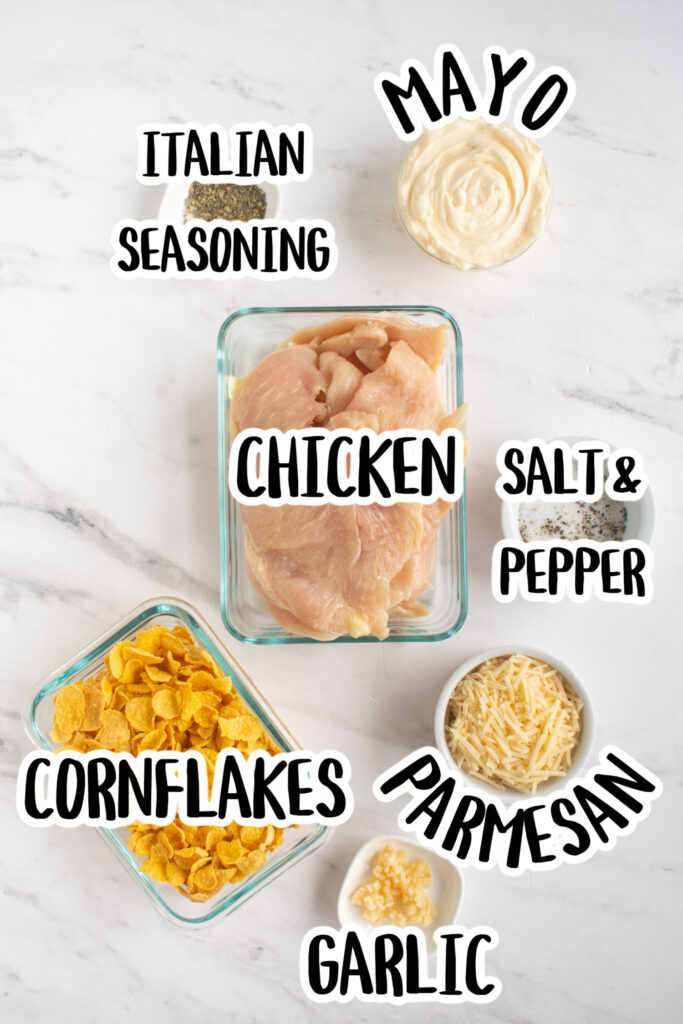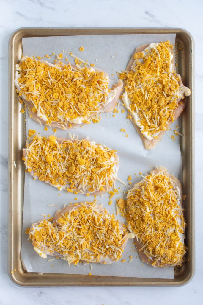 - Dredge each chicken breast in the mayo, coating it well. Then, coat the chicken evenly with the cornflake mixture, pressing gently to ensure it adheres.