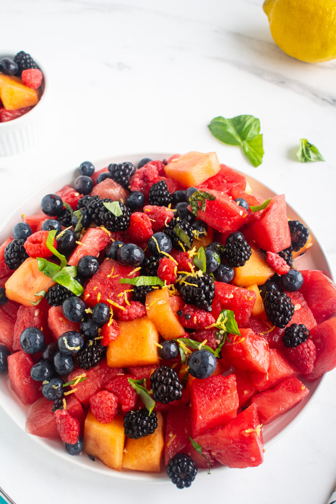 Combine the cubed watermelon, cantaloupe, blackberries, blueberries, and raspberries in a large mixing bowl.