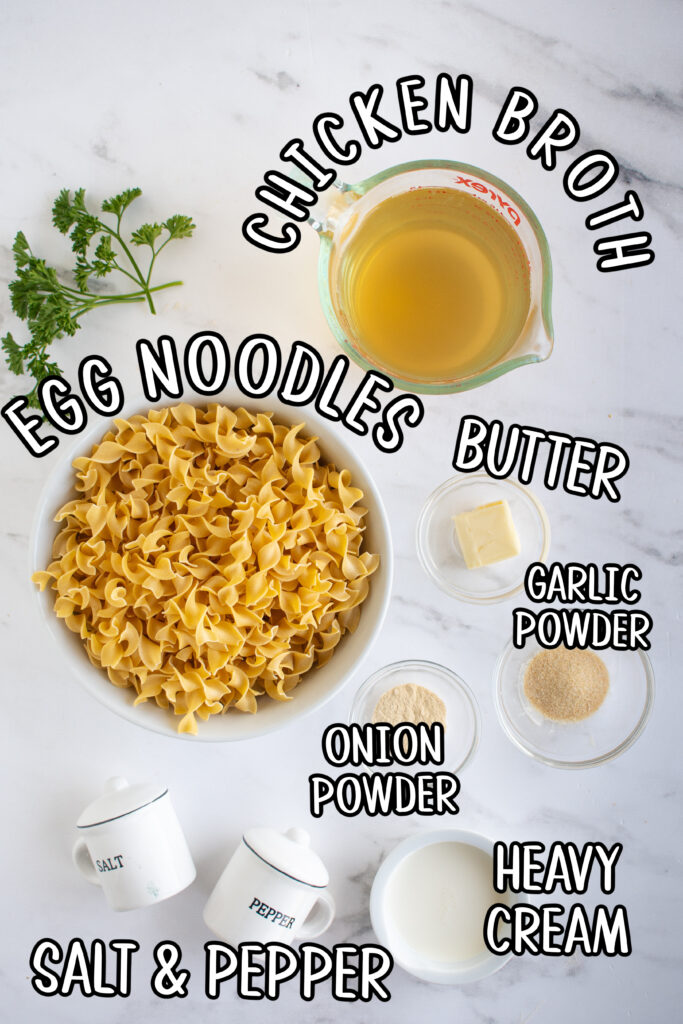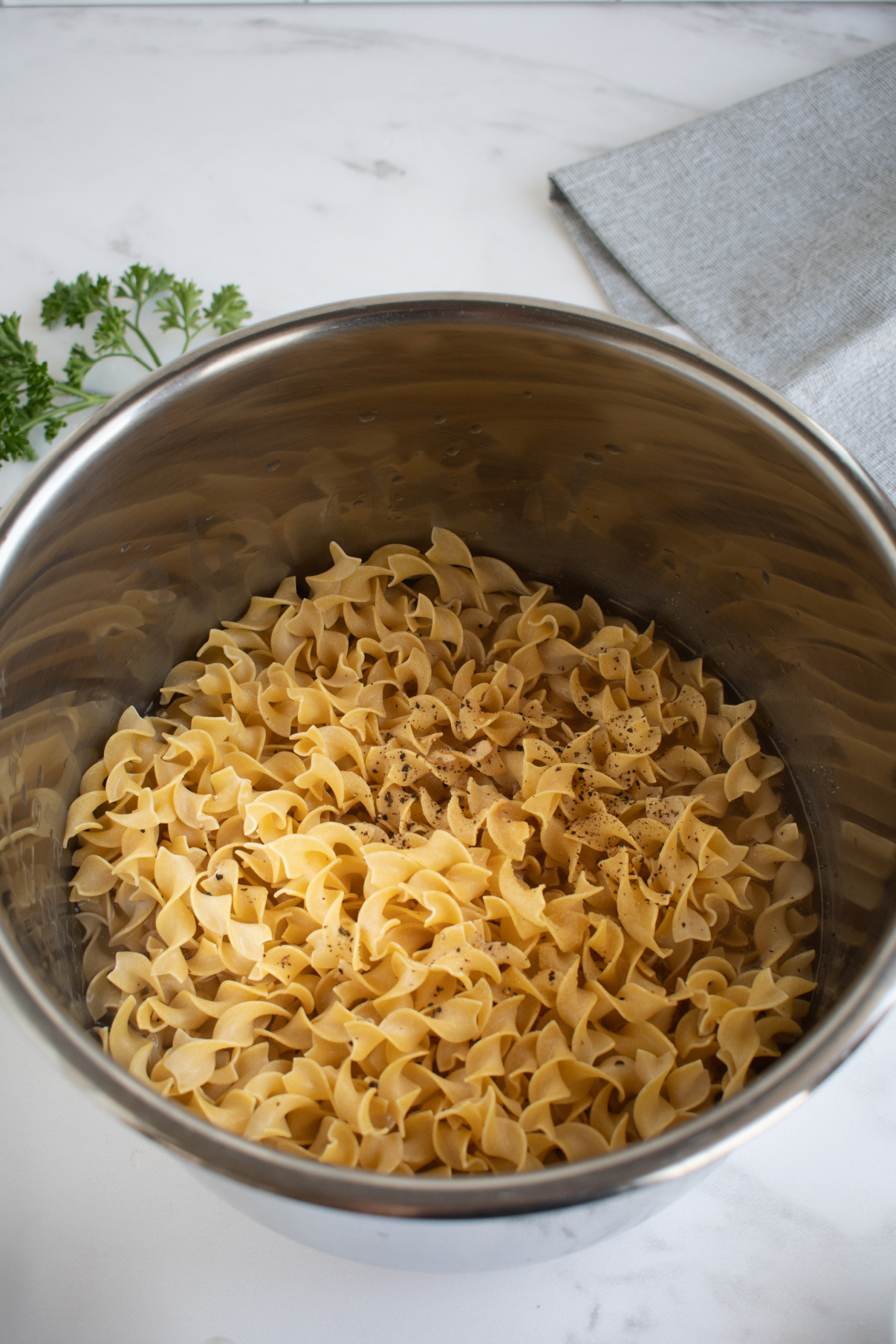 1. Add butter, salt, pepper, garlic powder, onion powder, egg noodles, and chicken broth into your Instant Pot pot.