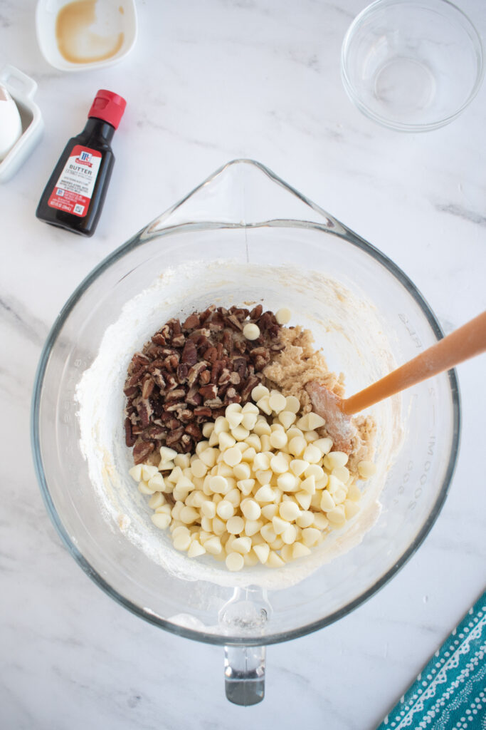 Add toasted pecan pieces and white chocolate chips to the cookie dough and fold them into it.