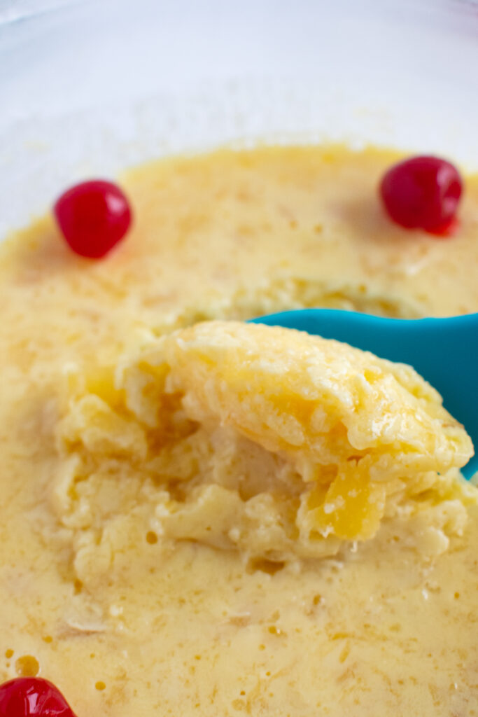 - Gently fold in the drained, cold, crushed pineapple. Make sure it’s distributed evenly throughout the Jello mixture.
