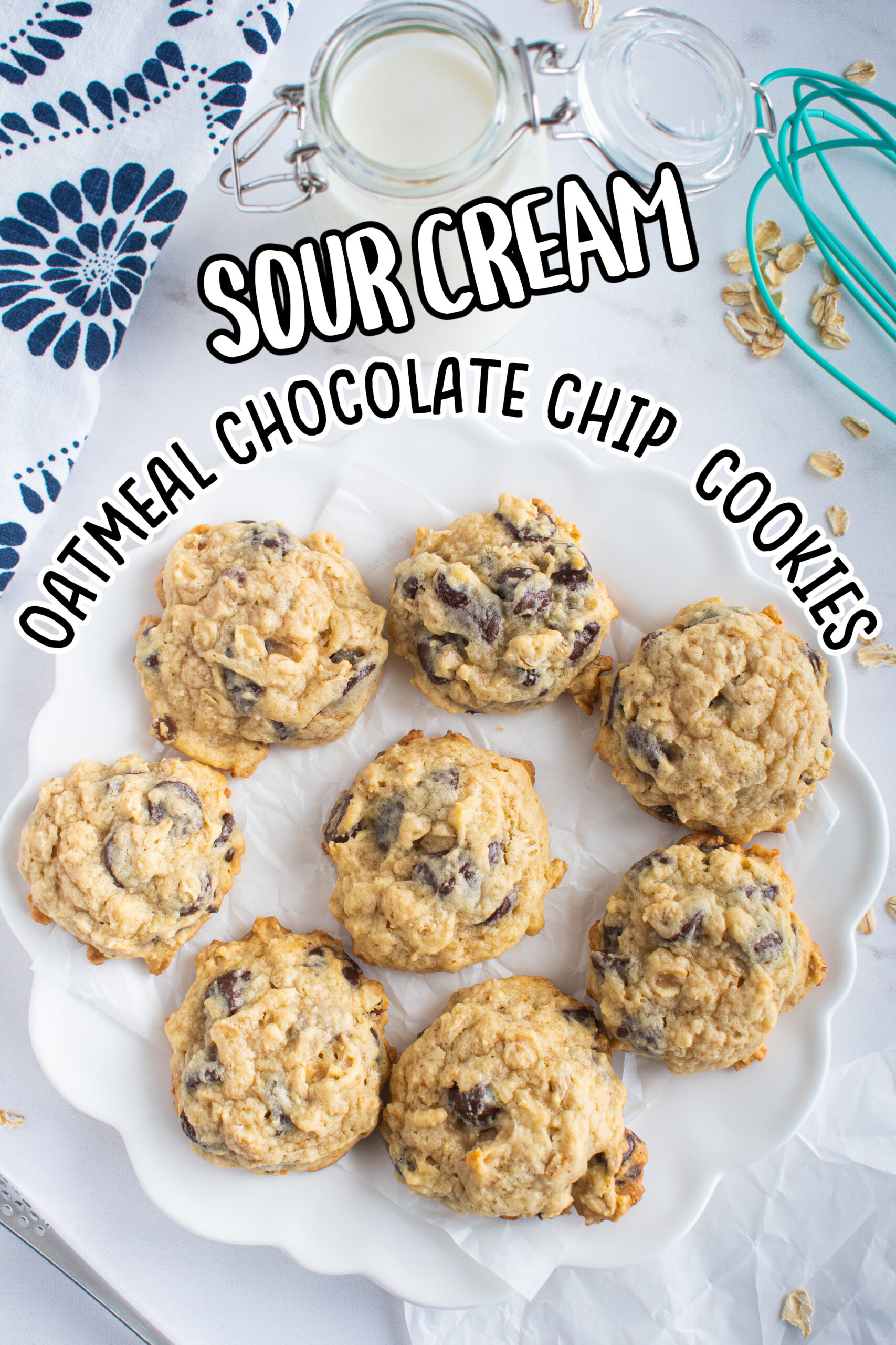 These chewy chocolate chip oatmeal cookies are the perfect after-school snack with a glass of cold milk! This recipe is inspired by my Sour Cream Oatmeal Raisin Cookies, inspired by a sour cream Amish sugar cookie recipe I saw years ago.