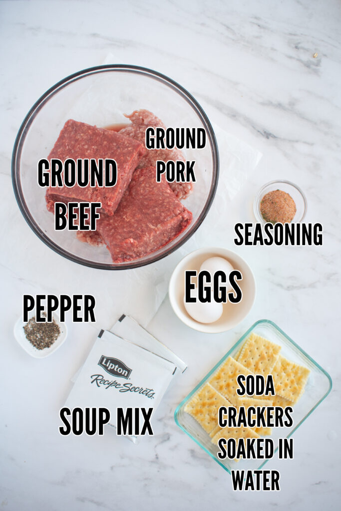 Combine Ingredients: In a large bowl, combine the ground beef, ground pork, softened crackers, eggs, onion soup mix, Pleasoning Seasoning (or substitute), and black pepper.
