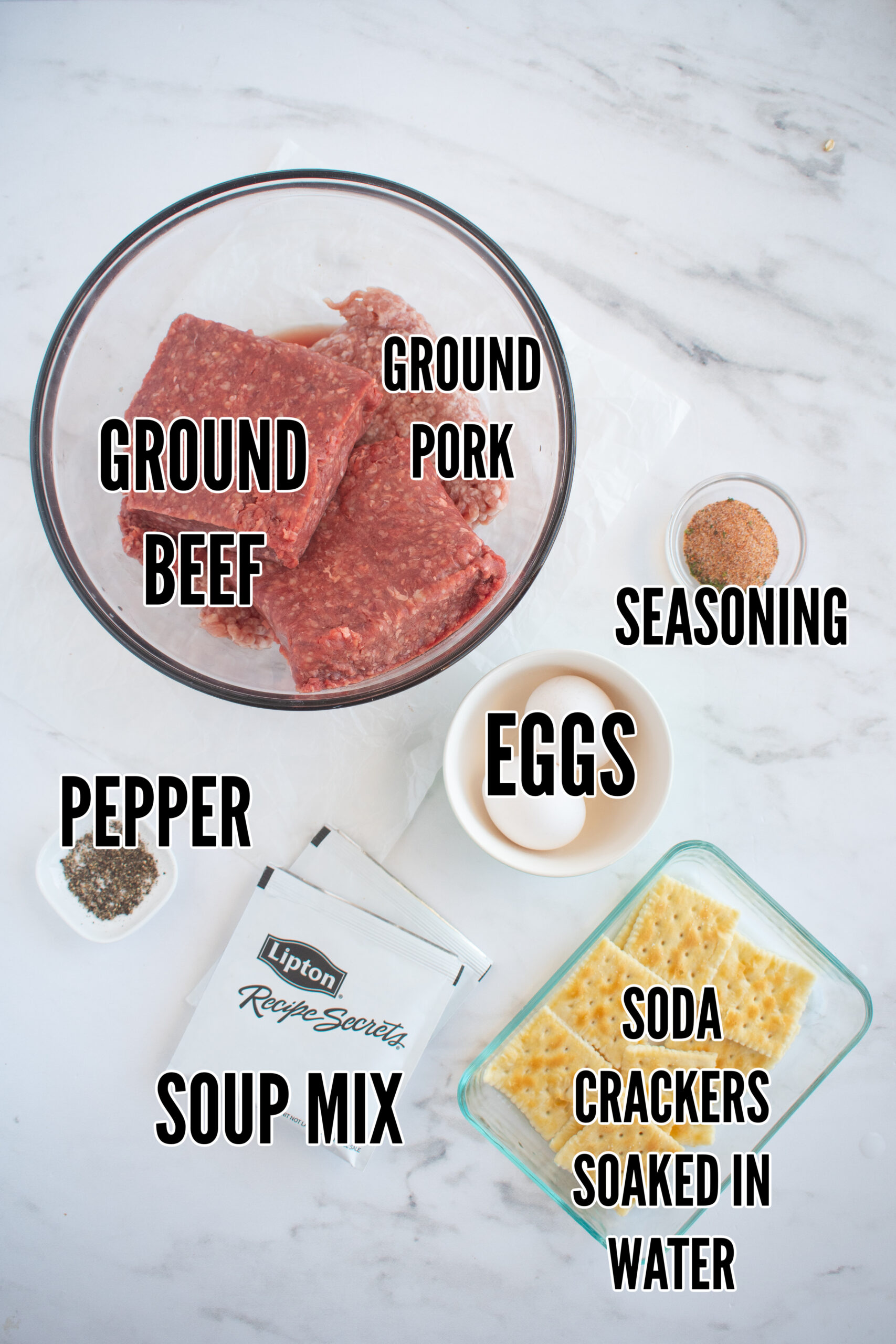 - Combine Ingredients: In a large bowl, combine the ground beef, ground pork, softened crackers, eggs, onion soup mix, Pleasoning Seasoning (or substitute), and black pepper.