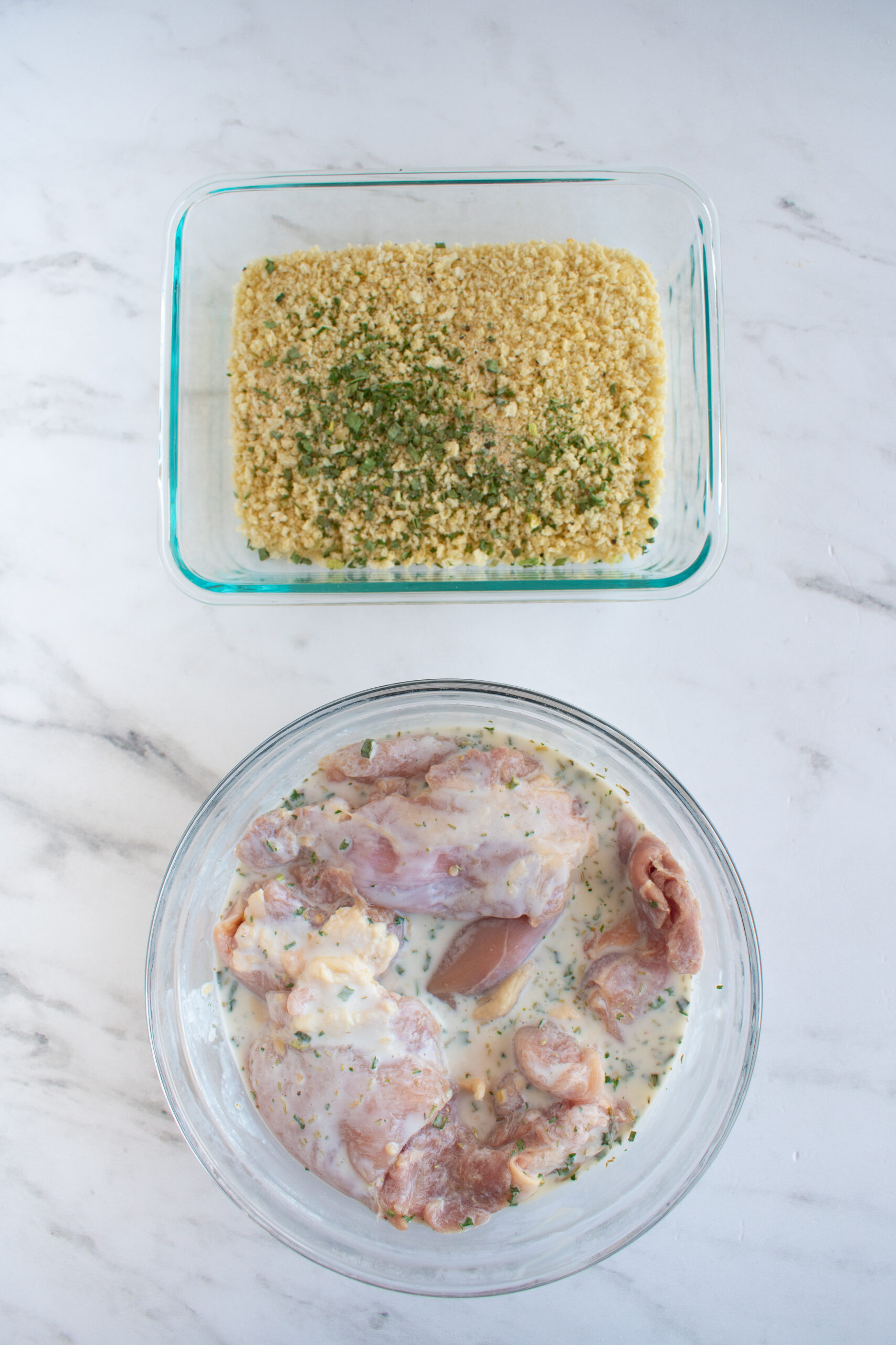 - Marinate the Chicken: In a large bowl, mix the buttermilk, garlic, chives, parsley, thyme, salt, pepper, and smoked paprika. Add the chicken thighs, making sure they’re fully coated. Cover and refrigerate for at least 4 hours, preferably overnight.