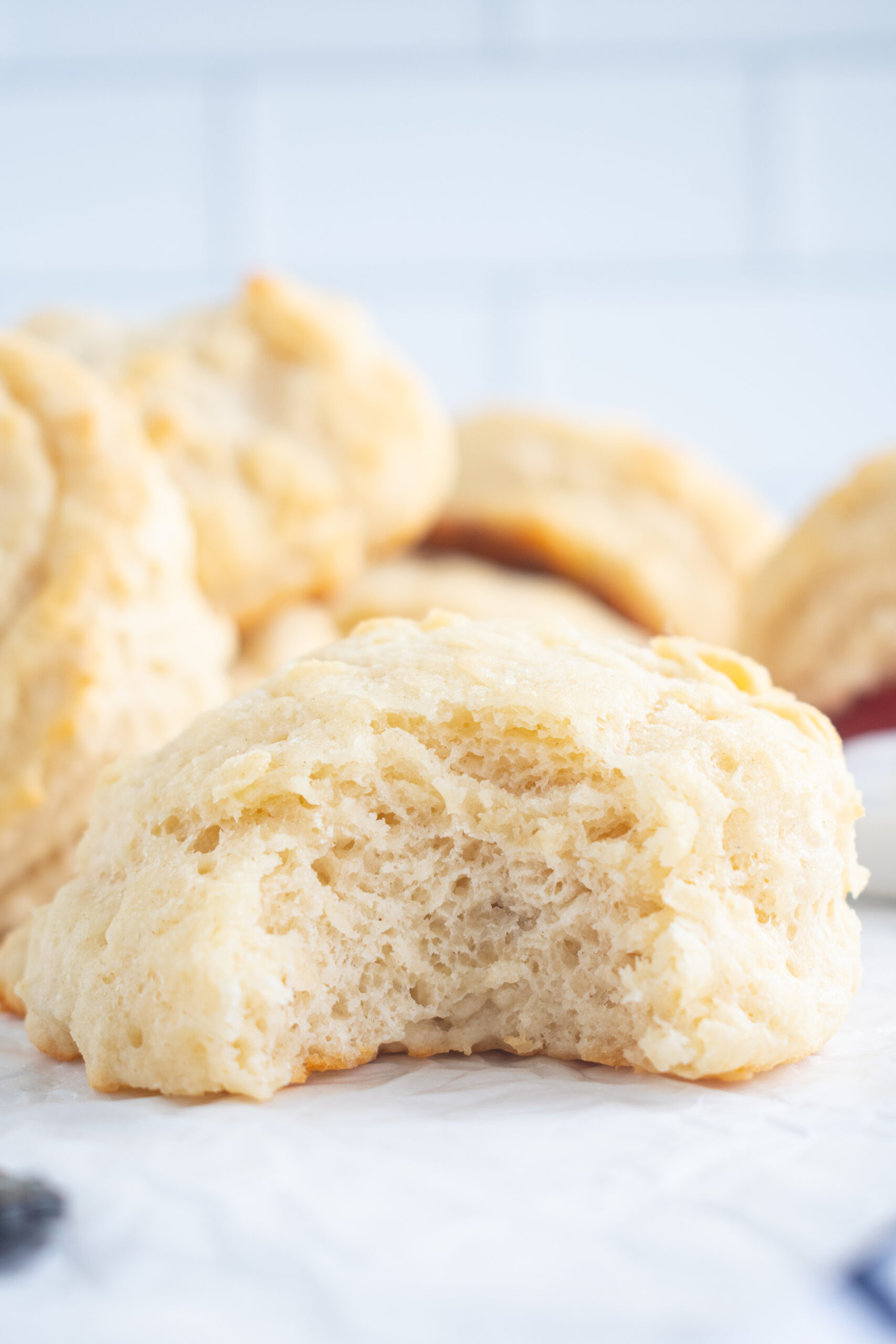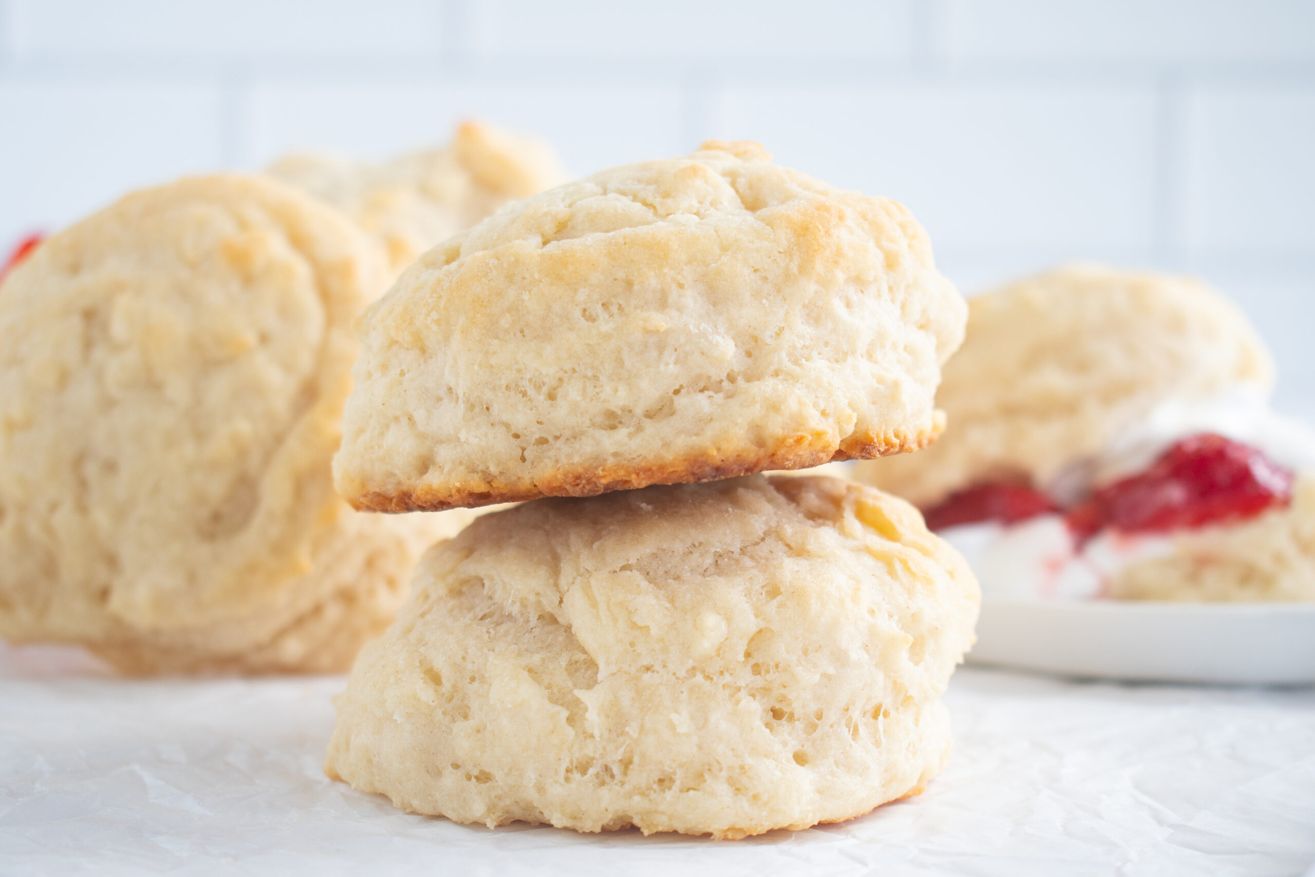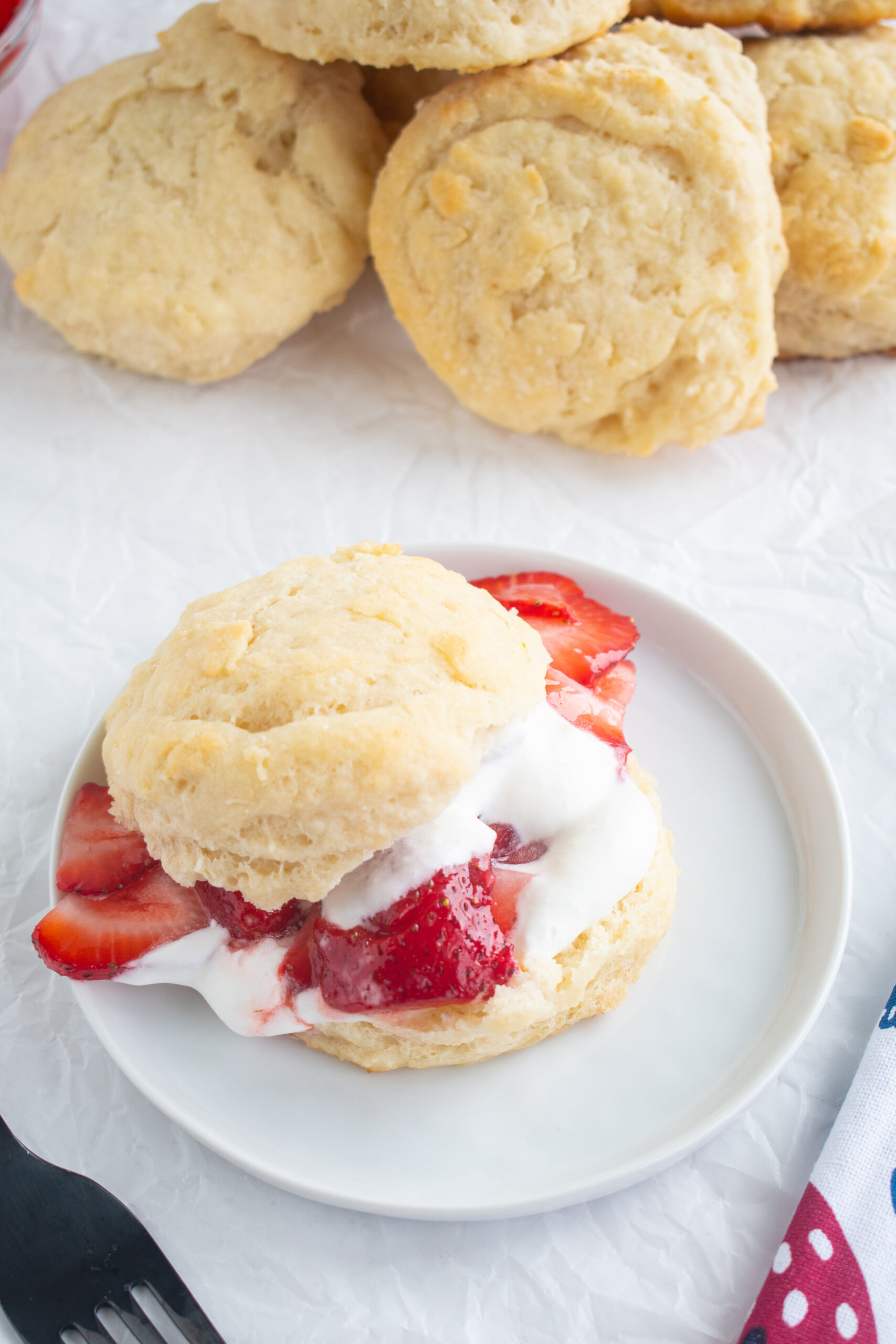 These biscuits are moist and tender and have the perfect amount of crumbs for soaking up the strawberry, vanilla ice cream, or whipped cream.