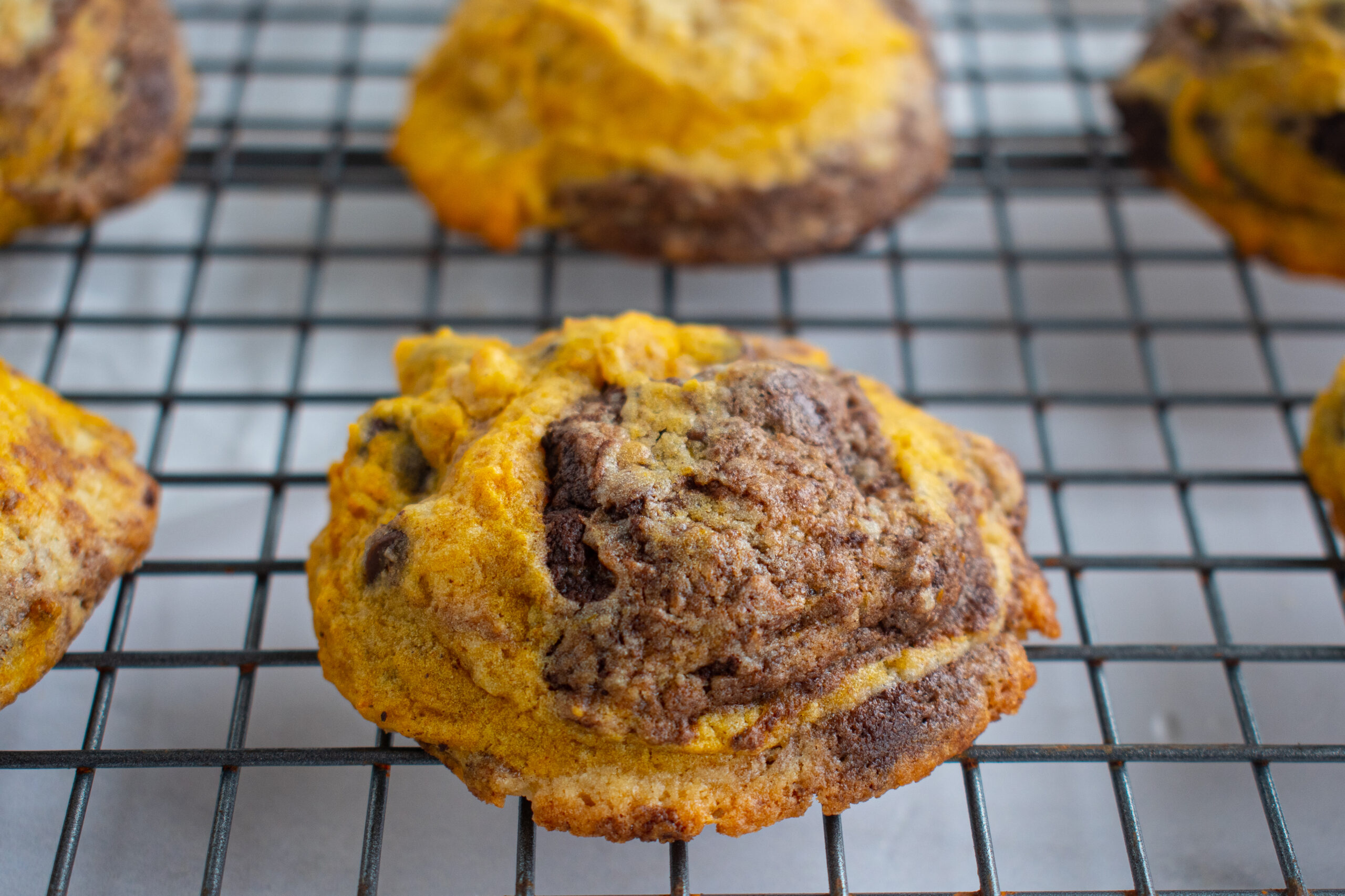 Pumpkin marble chocolate chip cookies are the perfect fall cookie recipe, with swirls of cozy spice and chocolate.